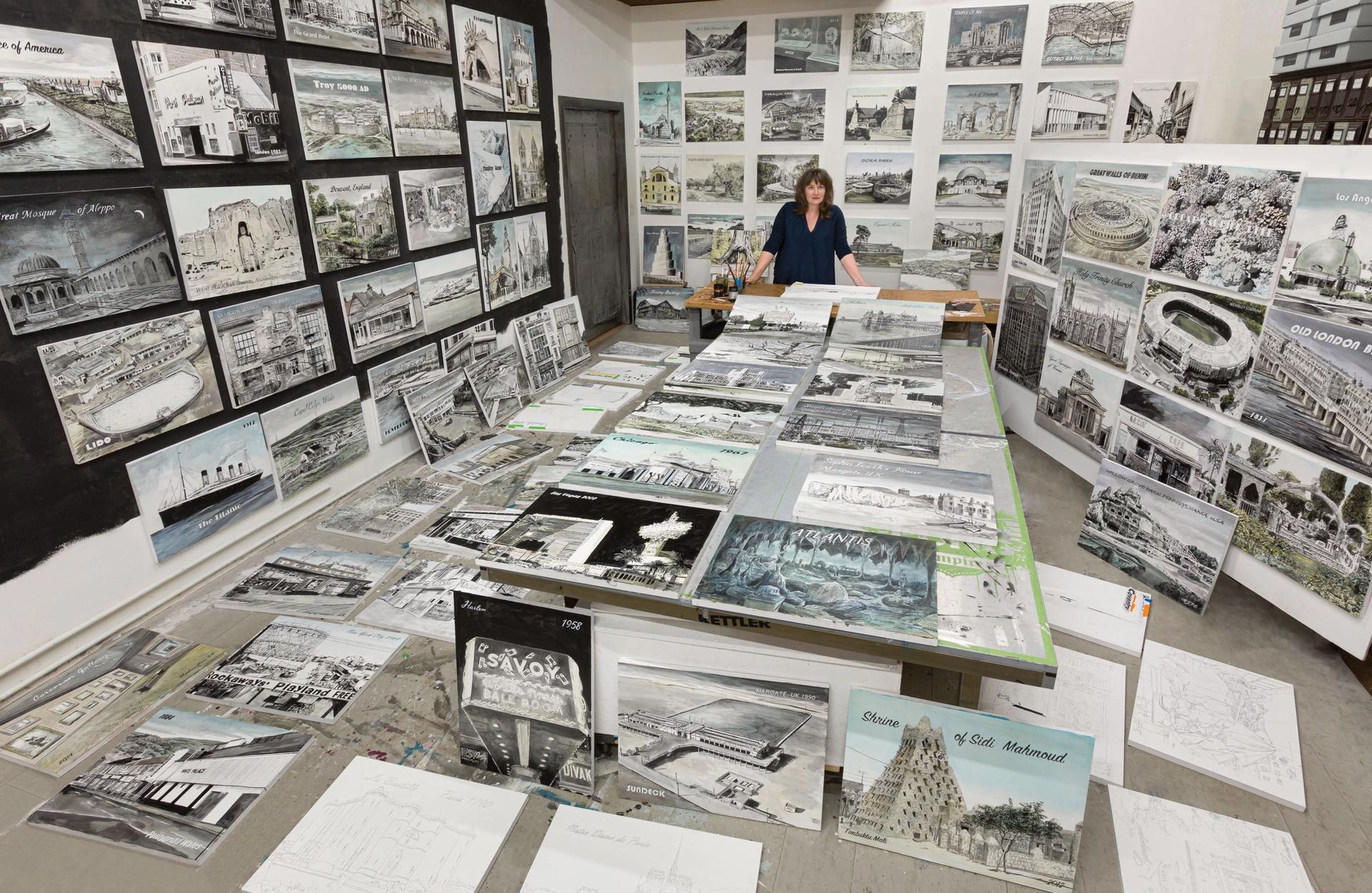 Ellen Harvey in her studio with works from The Disappointed Tourist (2020) Photo: Etienne Frossard