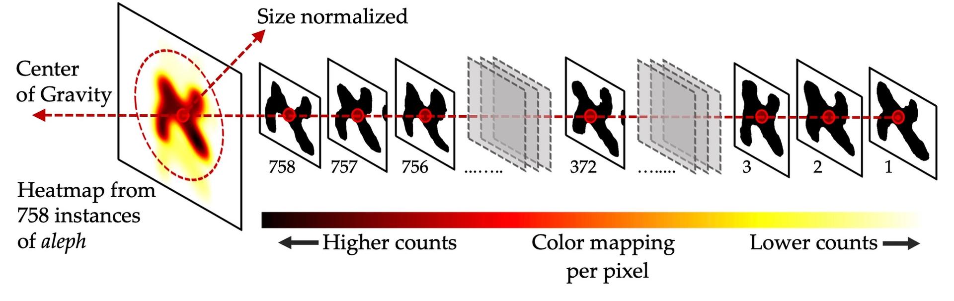 An illustration of how heatmaps of normalised average character shapes are generated for individual letters (in this example: aleph) Maruf A. Dhali, University of Groningen