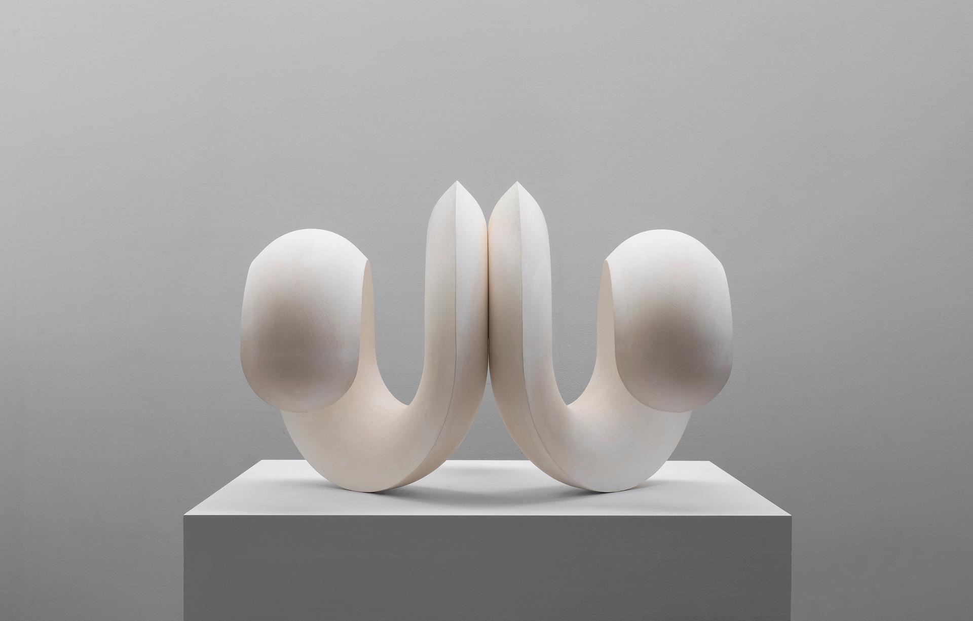 For both precision is key, and a rigorous sensuousness runs throughout the show. It plays out in the echoes that reverberate between the voluptuous but also tautly contained curves and coils of De Monchaux’s carved plaster sculptures and the precise scoops and points where Jaray’s colour planes align in the pair of paintings. Architectural references abound too, whether in the rows of lunettes in Jaray’s two Predella paintings of 2017 or De Monchaux’s quartet of carved lime works. In a letter, Jaray praises one of De Monchaux’s curvaceous sculptures as expressing “the controlled wildness of later life” while he in turn salutes Jaray’s paintings for showing her “at the height of her powers," echoing the wholly evident sentiment that these two artists, in their skills and abundant energy, are still at the top of their game.
