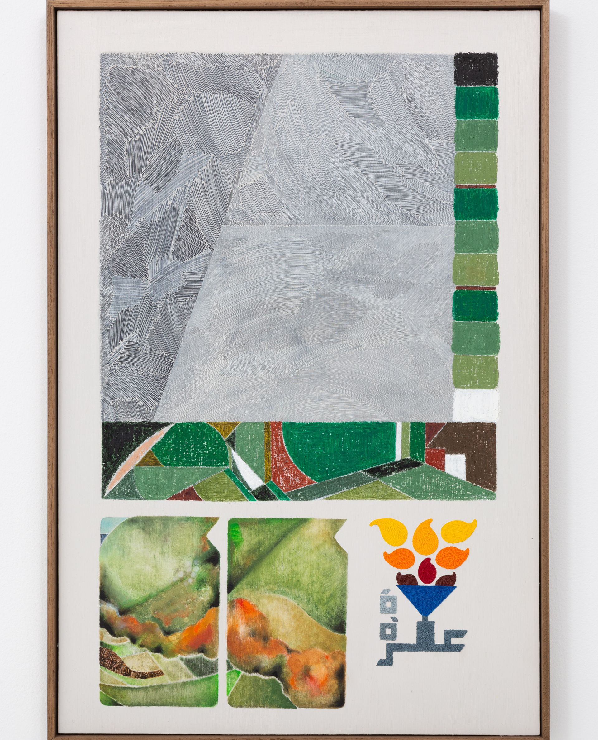 This solo show of new abstract oil paintings by Haroun Hayward digs into the disparate cultural influences of the artist's upbringing in Haringey, North London in the 1990s, allowing him to negotiate the confluence of heritage that informs his identity. Bold geometric forms in bright primary colours resemble the woven South Asian rugs his Pakistani mother would decorate the house with, while circular shapes evoke Indian Yantras—diagrams from Tantric traditions. Equally present in more sombre coloured sections are the influences of Vorticism and the landscapes of Paul Nash.
