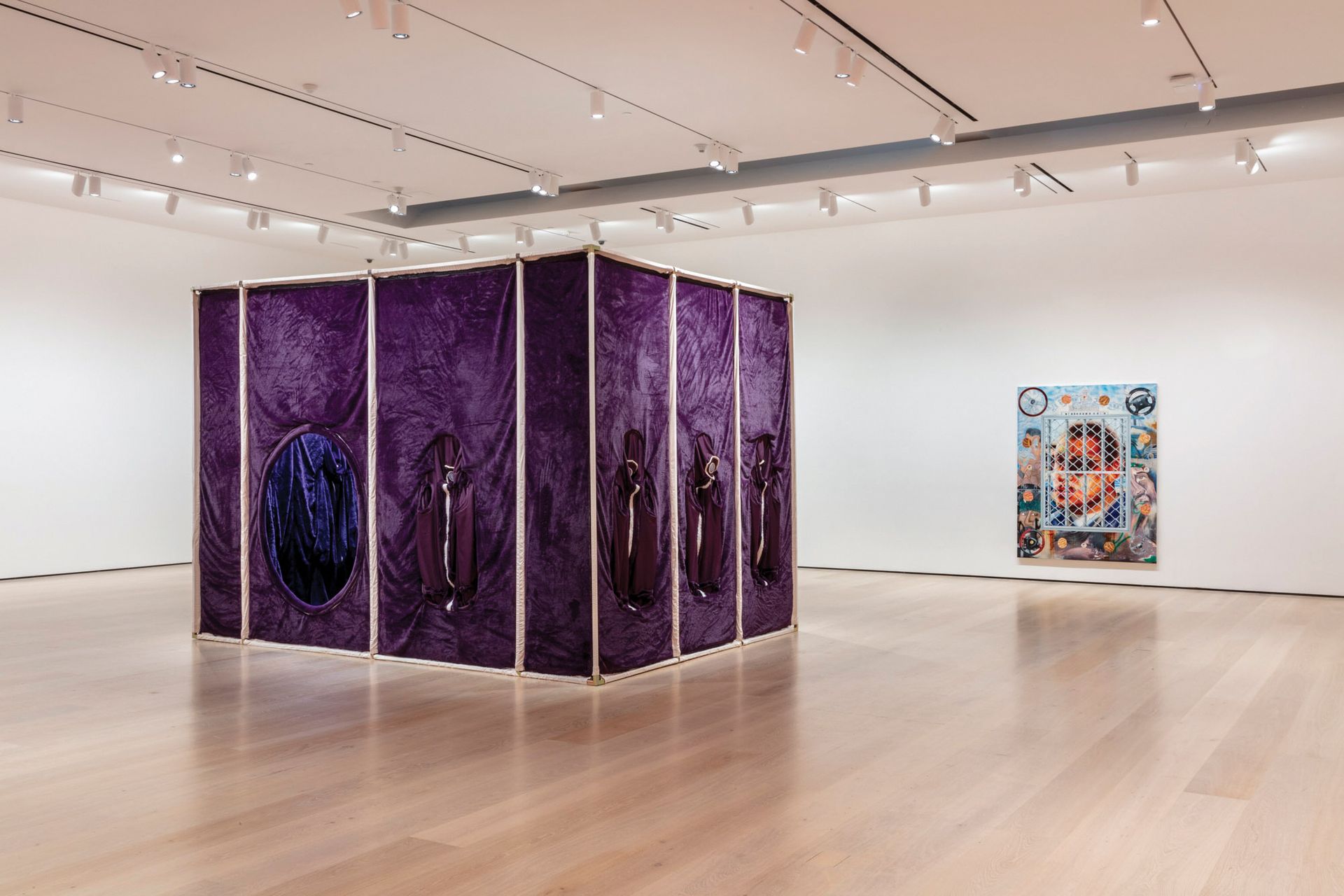 Certainly the pandemic did reshape the biennial, most dramatically in the case of Nicola L., the Paris-born, Los Angeles-based artist who died in late 2018. Her estate’s contribution to the Hammer, a recreation of La Chambre en Fourrure from 1969, is a furry purple box that you could, in better days, walk in and around and experience even more intimately by thrusting your hands into fuzzy sleeves hanging from it and placing your face against some plastic mesh. But what would have seemed playful and inviting just two years ago now seems life threatening, and the work on view is essentially a fossil. It makes you wonder about the future not just of interactive works but of hands-on museums everywhere, from children’s museums to science centres.
