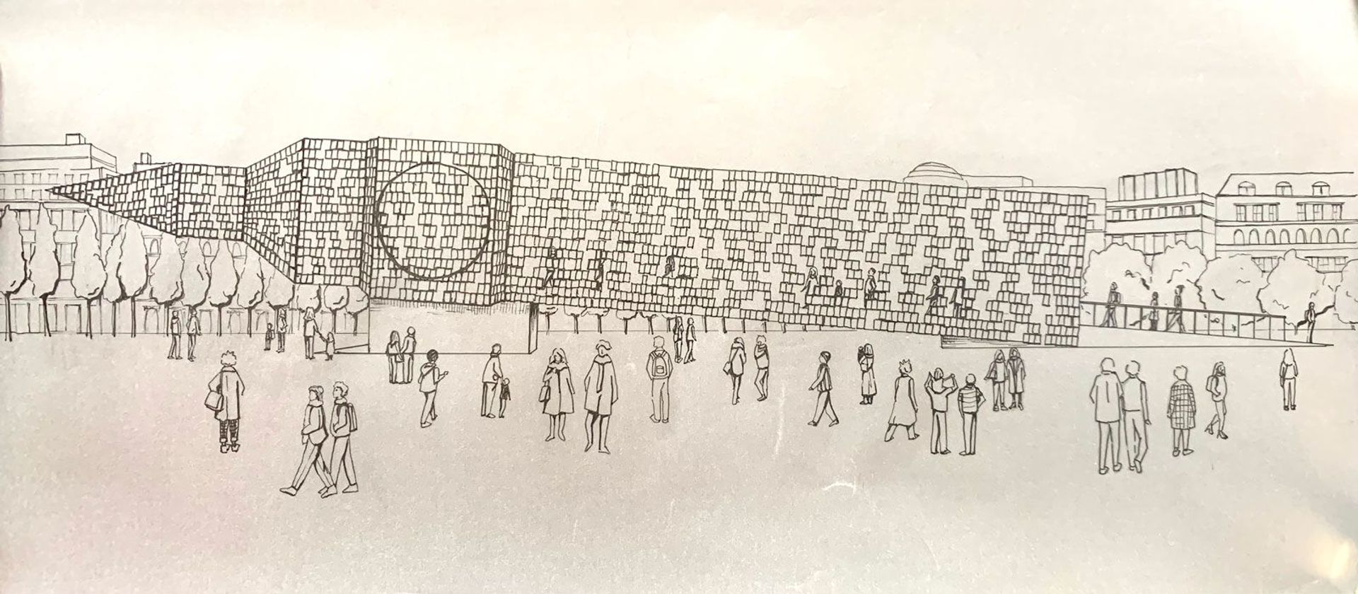 A drawing of Marta Minujín's Big Ben Lying Down with Political Books © Marta Minujín