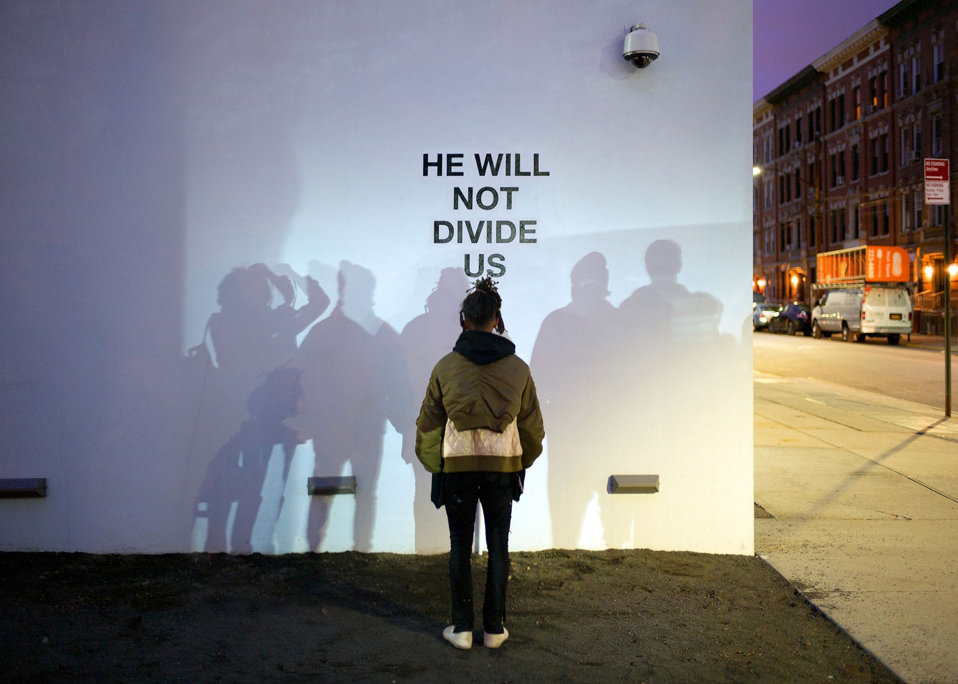 He Will Not Divide Us (2017) was projected outside the Museum of the Moving Image in New York Courtesy of Luke Turner