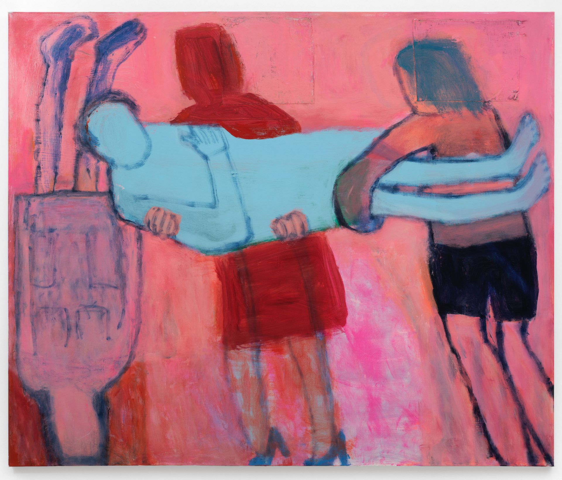 Katherine Bradford explores varying degrees of familial intimacy across seven new works in this exhibition. While her particular touch with colour is consistent here with recent bodies of work, these paintings feel new for the artist, both in her handling of the figures and in the sense of narrative that she embraces. Subjects in these paintings relate to one another in a fresh way—though they float in and out of the picture plane, which is a dependably seductive aspect of Bradford’s work, they now bump into one another and connect in subtle ways that imply lifetimes’ worth of affection and desire. There are tender, healing embraces, as well as lonesome ones; touches that look like unconscious reflexes of lifelong adoration, and others that sting with their oafish straining, all of which are familiar. Cumulatively, the show crescendos into a sense of wonder at the ways in which our lives are spent simultaneously together and alone; how love is both a tragedy and a comedy, and how right and vital it feels to swim in it.