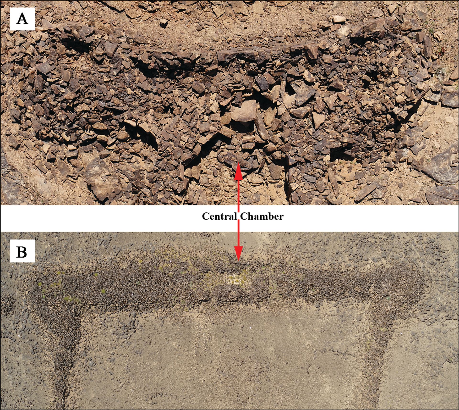 Top, a section of a mustatil with the central chamber marked; and a broader outline of the structure AAKSA and Royal Commission for AIUla