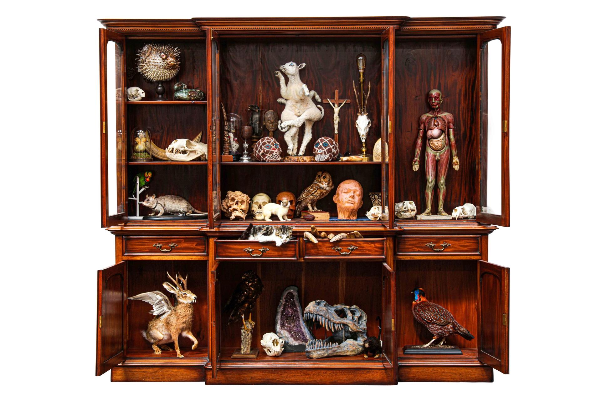 What would he point out as particular highlights? "There's the striped unicorn head, there's the world's worst taxidermied flying kitten, there's all the extinct birds. There's a bezoar, an incredibly beautiful spherical hairball from an ungulate that in medieval times were seen as a sort of universal antidote and medieval treasuries have them in magnificent cases. For whatever reason, they're extraordinarily rare. Next to that is a desiccated baked potato that I forgot and left in the Aga."