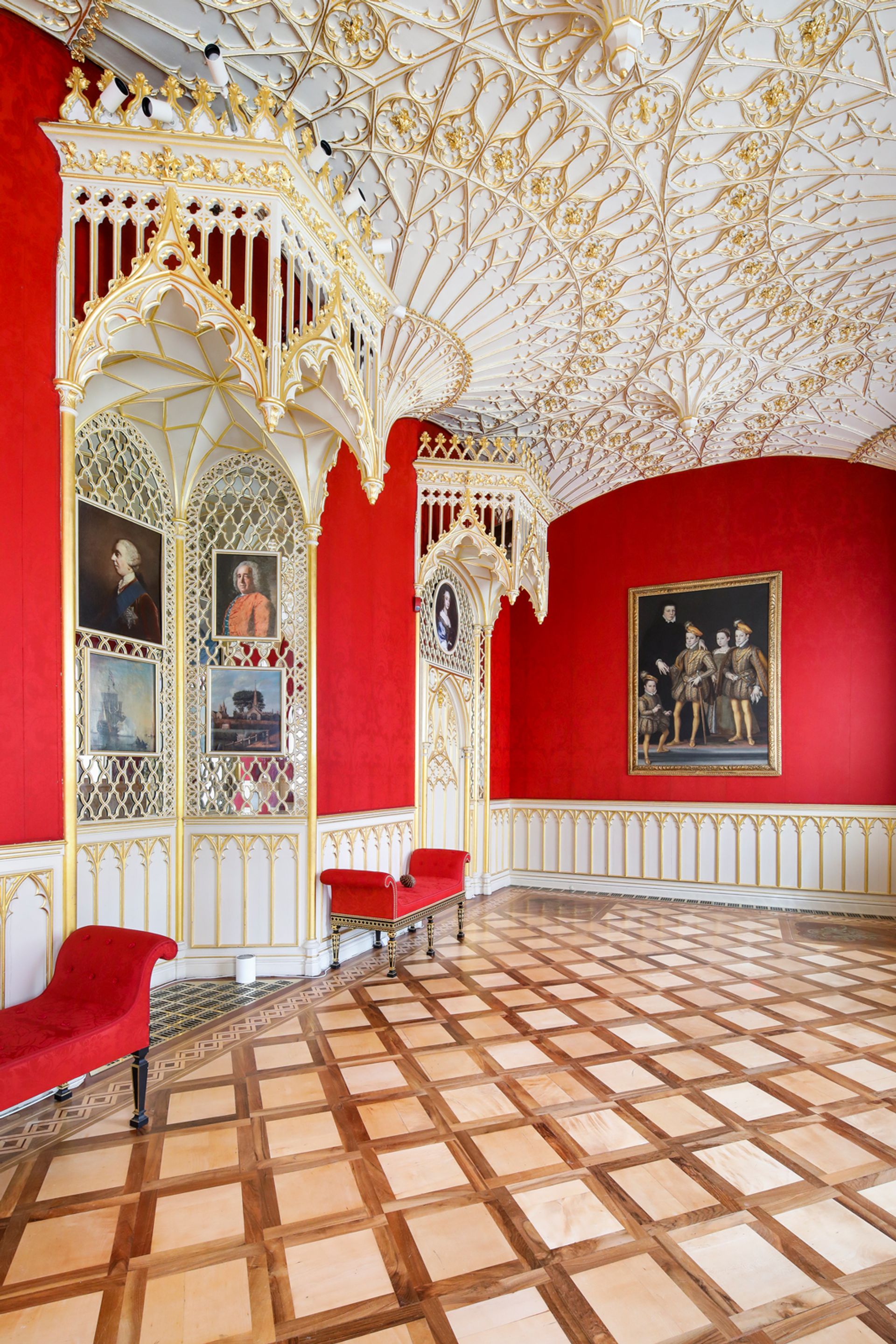 His treasures filled the extraordinary house he created, the origin of the term Strawberry Hill gothic, a wild conversion of a modest red brick cottage into a fantasy of the middle ages, with fireplaces, book cases and ceilings modelled on the tombs of saints and kings. It was so famous and visited in its day that Walpole grumbled, "I keep an inn at the sign of the gothic castle”.