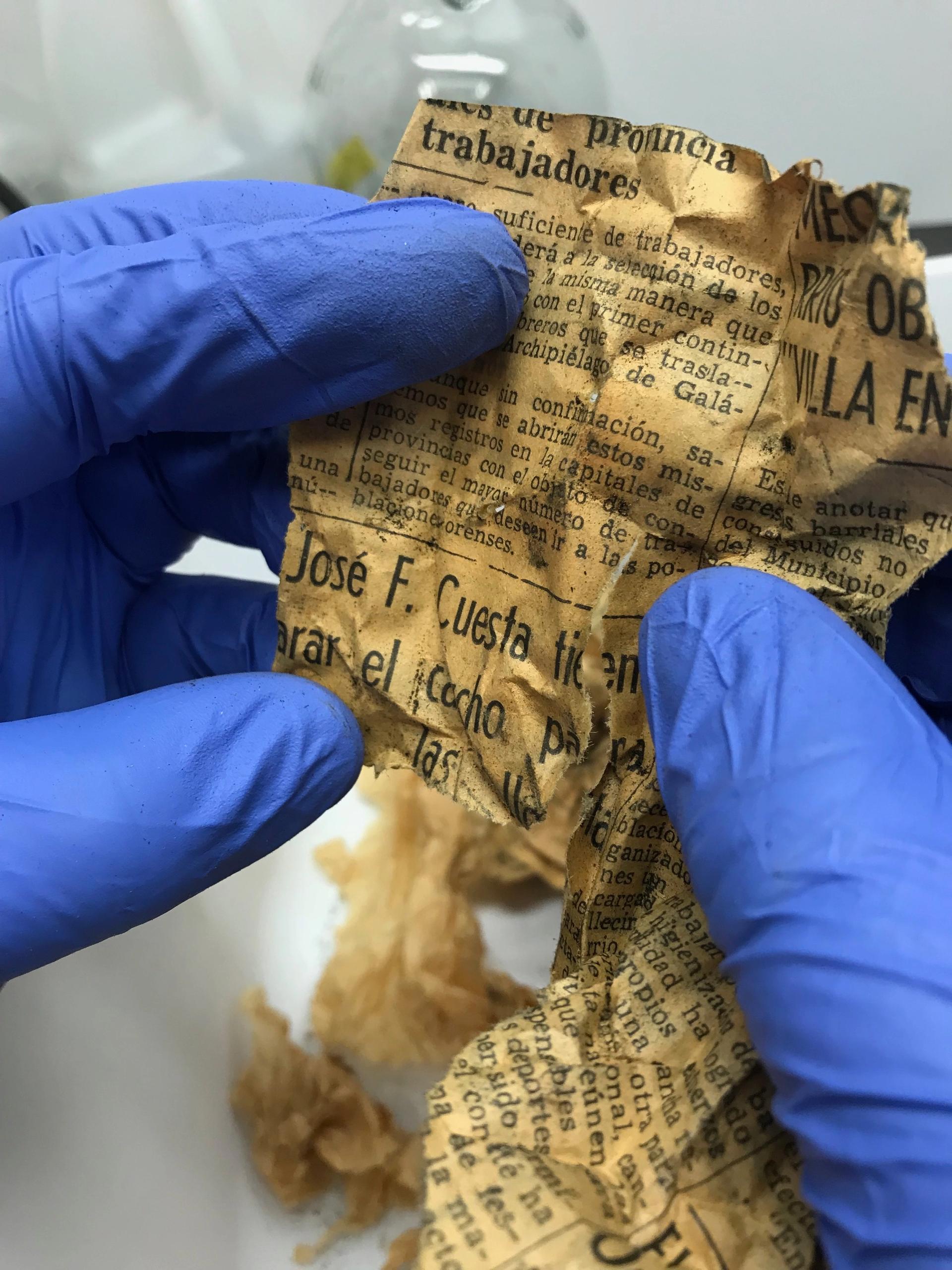 Pieces of an Ecuadorian newspaper were found inside the tsantsa, confirming that it was packaged up for travel in 1942 Photo: Adam Kiefer