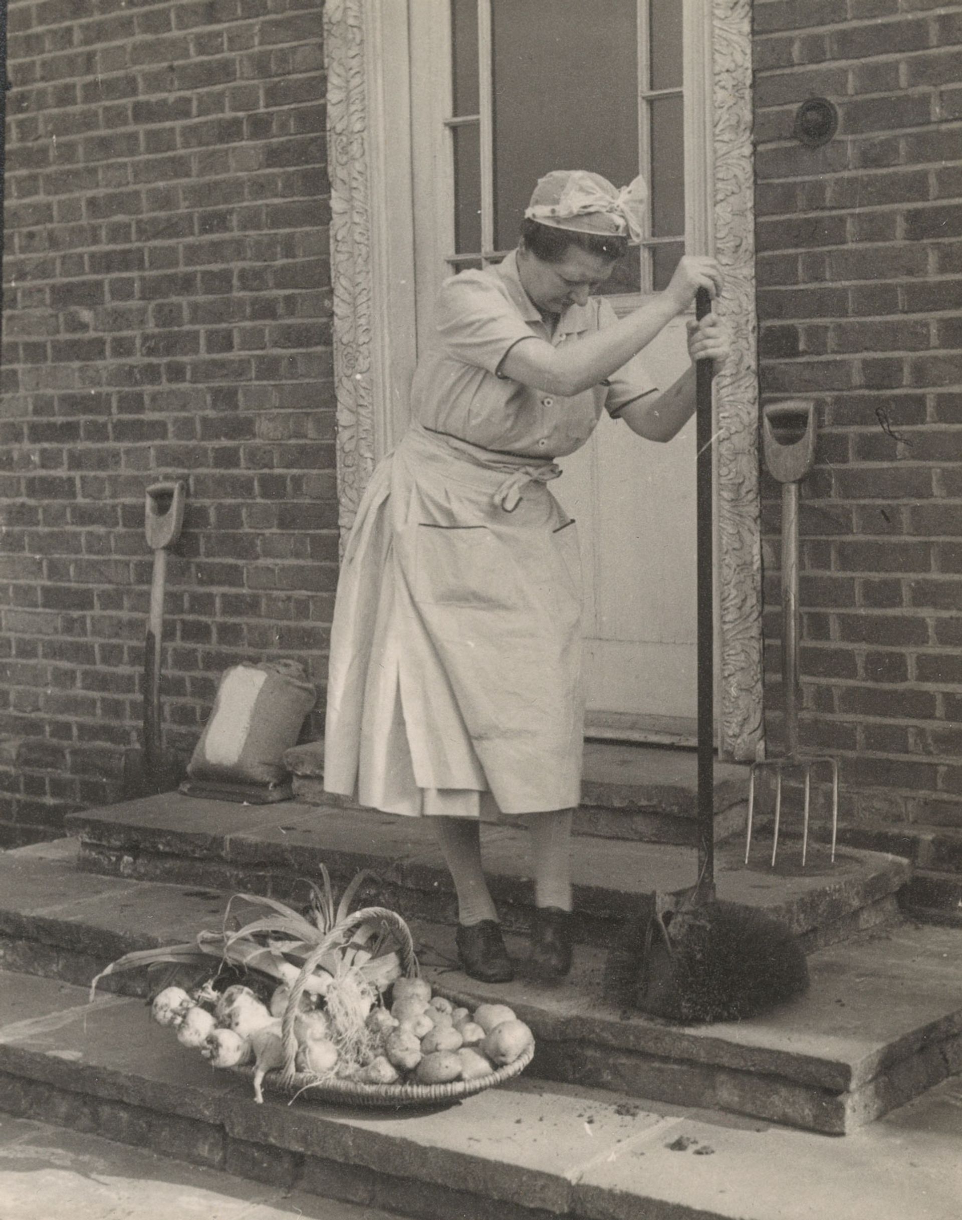 Constance Spry photographed in the early 1940s scraping mud off her shoes RHS Lindley Collections