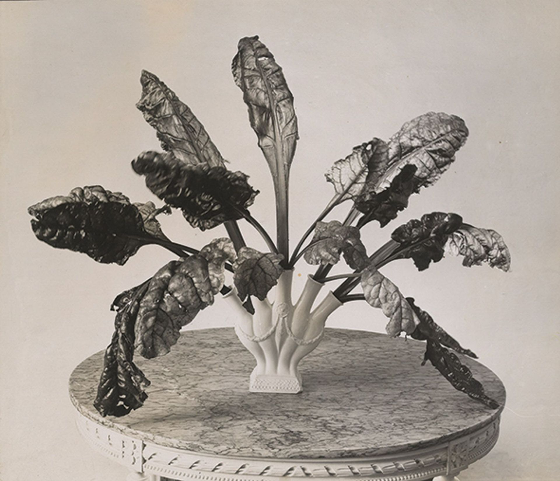 Spry pioneered the use of unusual plant material, such as these chard leaves, in her arrangements Photo: Reginald Malby; © RHS Lindley Collections
