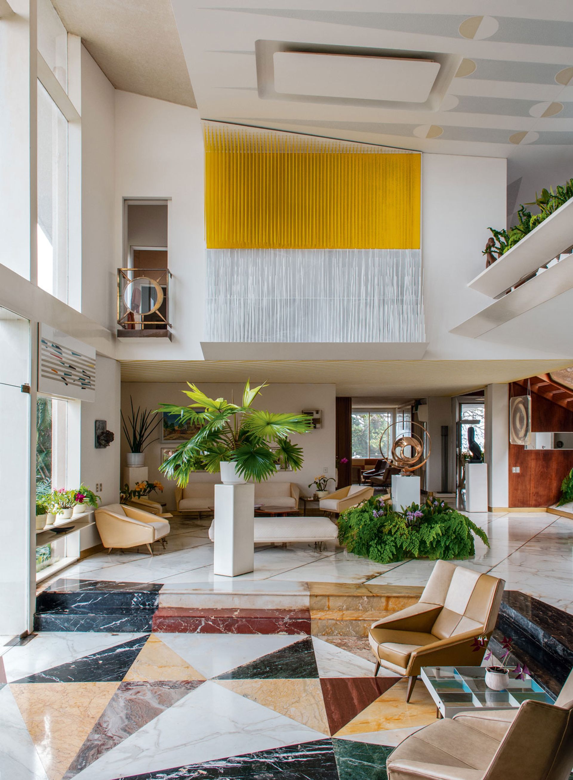 The interior of the Villa Planchart in Caracas, Venezuela, was fitted out by Ponti in the mid-1950s and includes his Mariposa leather armchairs in the foreground and a sofa from his Diamond series in the background. The large site specific work by the Venezuelan artist Jesus Rafael Soto was added later.