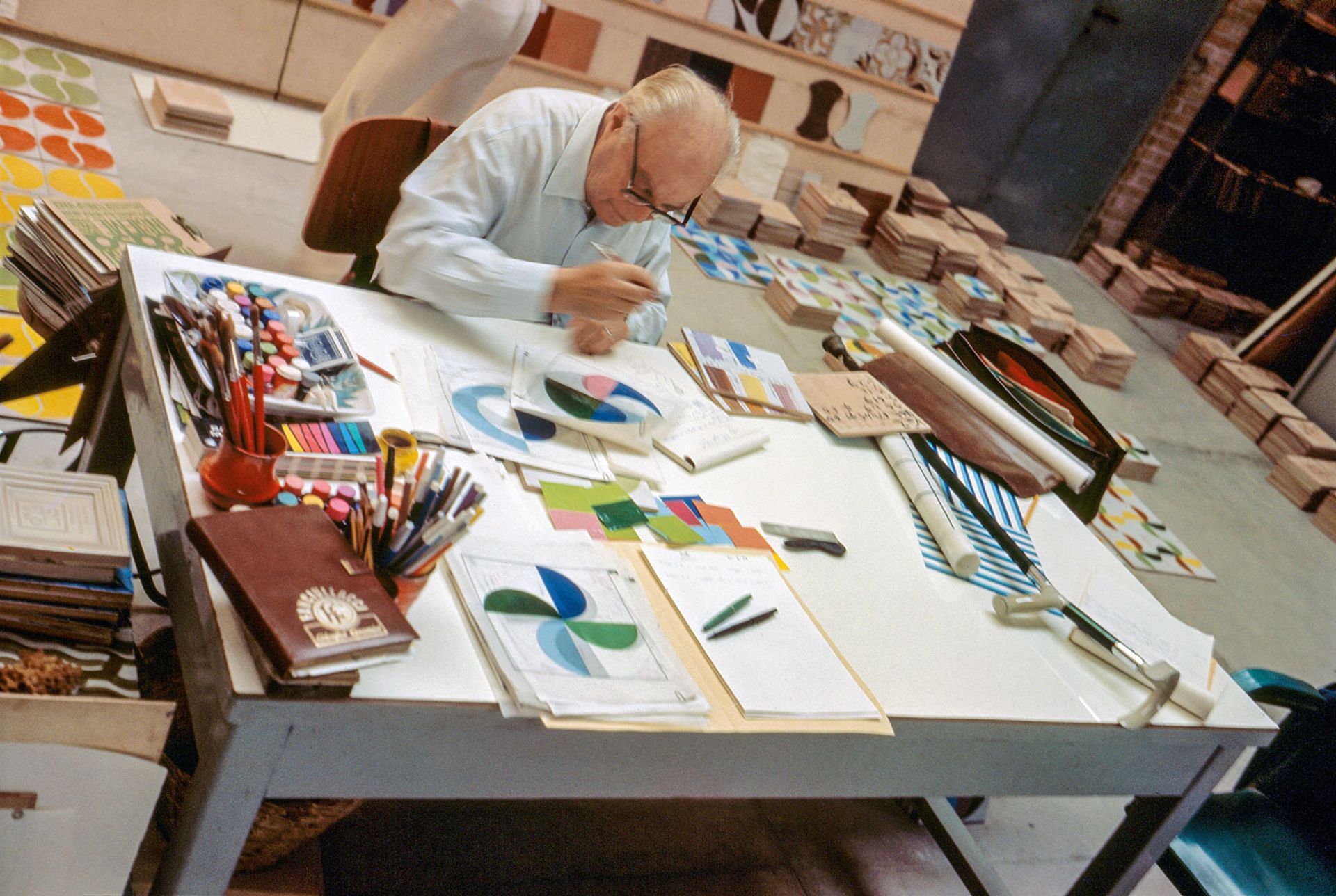 Gio Ponti hard at work designing geometric ceramic floor tiles at the Ceramica D’Agostino factory in Salerno in 1964. The tiles would be used in several of his interiors, including the Parco dei Principi hotels.