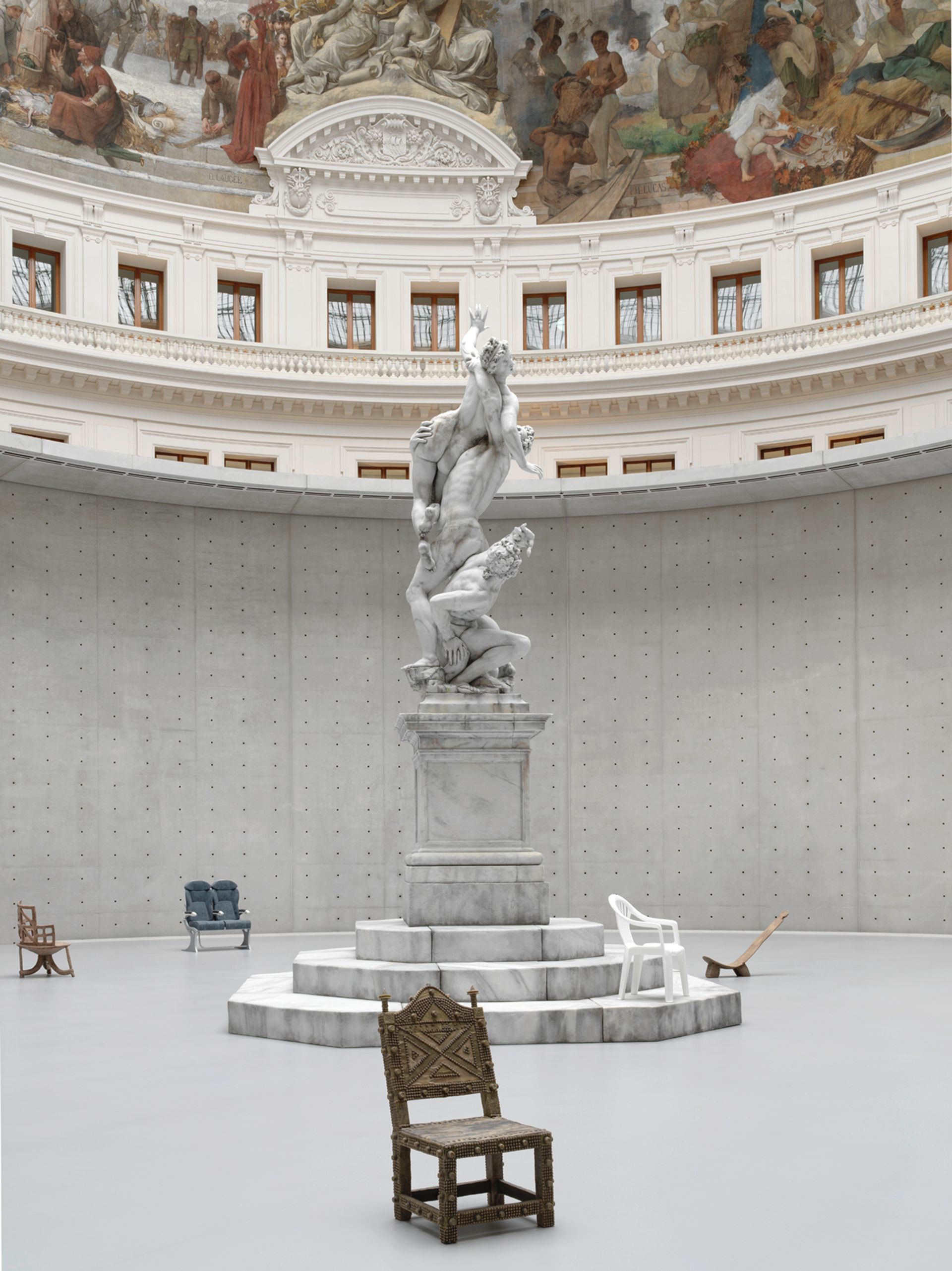 Inside, the site's architect Tadao Ando has built a 9m-high rotunda in pale grey concrete in keeping with the building's historical character. Its inner circle is occupied by Urs Fischer’s wax copy of the 16th-century Florentine sculptor Giambologna’s Rape of the Sabine Women. Each morning, holes are drilled and wicks are inserted to be lit, causing the progressive meltdown of a work that will disappear over the next six months. The model seemed impressive when it was shown for the first time in Venice’s Arsenale ten-years-ago, but this 29m-wide-space changes the perspective. The pedestal has been raised, but one is unsure whether a few wax chairs surrounding the statue suffice to occupy such a huge space.