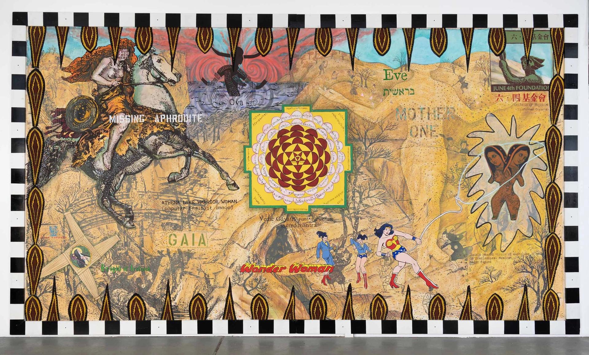 Mary Beth Edelson, In Exile (1989), acrylic, fabric, and collage on canvas