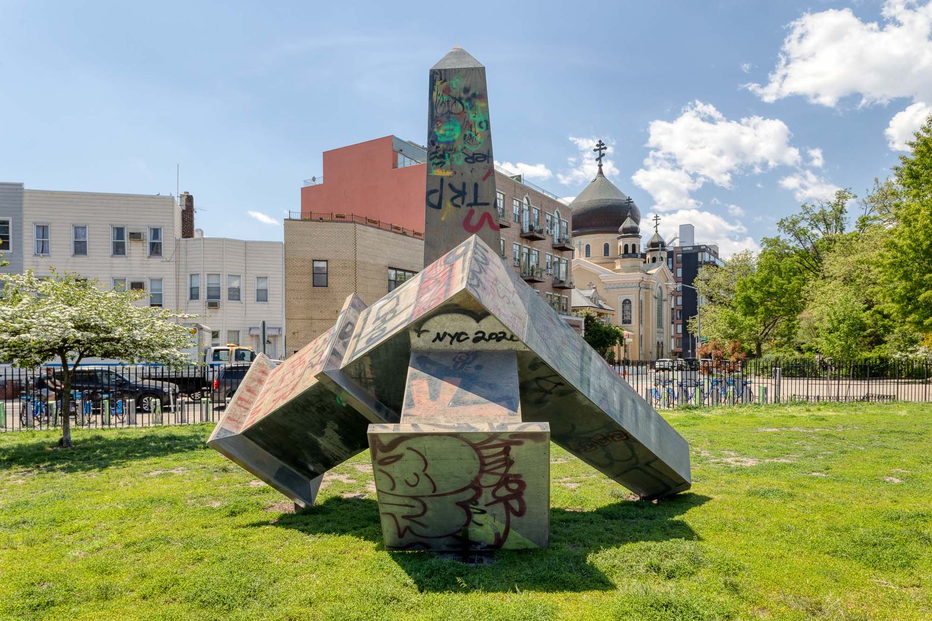 “The stark contrast of boarded-up buildings opposed to the typical dreamy transparent retail windows was the visual roadblock that sparked the project,” Hamamoto adds. As a result, many of the pieces have a clear activist bent, from RockIt Black, a sculpture by the Brooklyn-based artist Tanda Francis of a goddess-like Black figure installed in Queensbridge Park, to Be Heard a conical megaphone by the Benin Ha Design Studio in Thomas Paine Park, Manhattan, or Miguelito by Michael Zelehoski, which turns the tradition obelisk monument into a twisted caltrop.