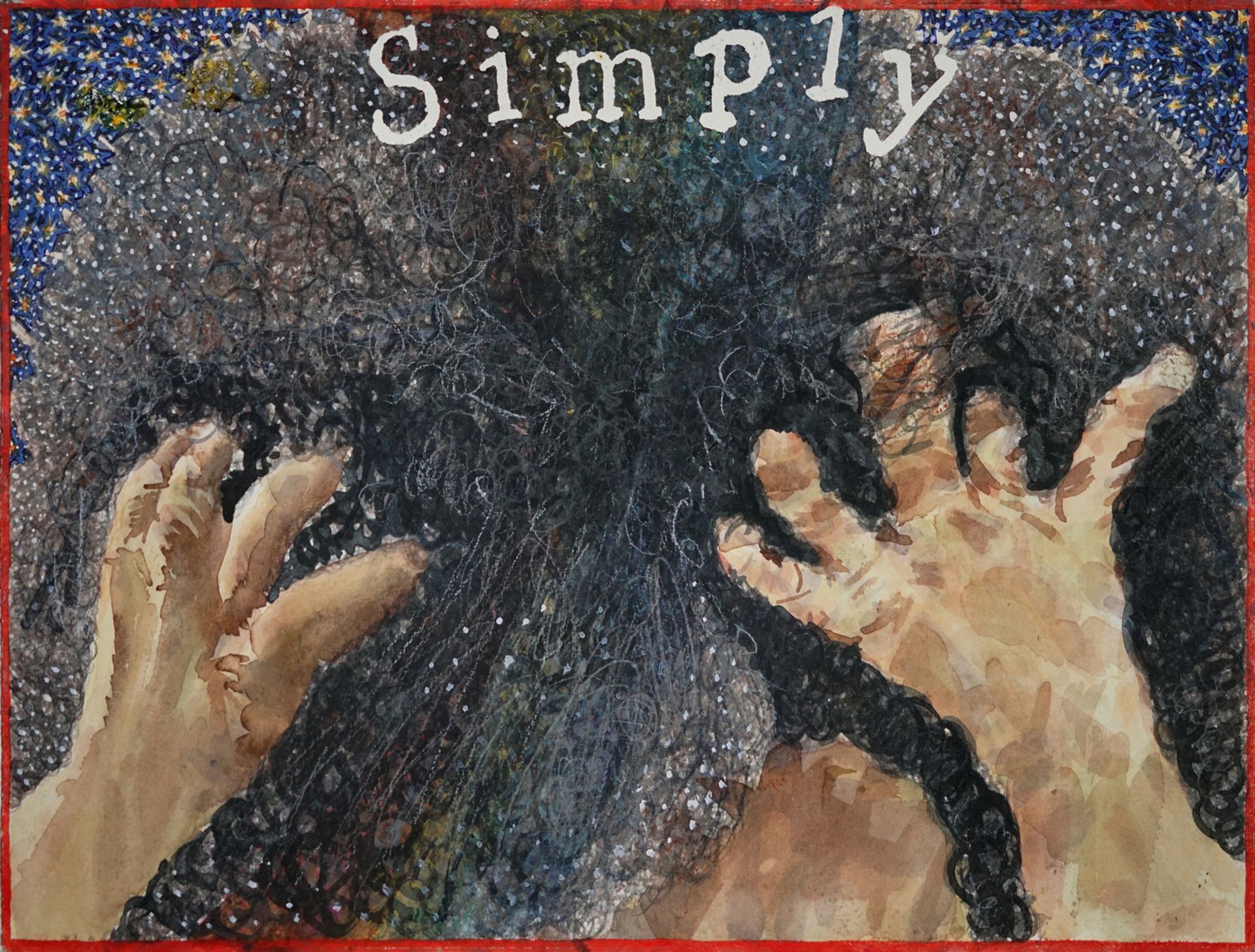 Despite the dark stories that run through her work, there is also a lot of joy and celebration. One watercolour on display at Bosse & Baum shows a Black woman, face obscured, running her hands through her massive Afro which takes up most of the composition. “This was about me trying to capture that feeling of not being able to comb my hair, so I have to run my hands through it instead, which is an incredible feeling,” she says. The figure is framed by a dark, starry night which creates the impression of a Black goddess shaking the stars out of her hair. “Yes, it’s like a myth about how the stars were created,” Montserrat says. The word “simply” floats at the top of the work, a reference, Montserrat says to the simplicity of the gesture of running hands through hair, which “feels good; it’s simple self care,” she says.