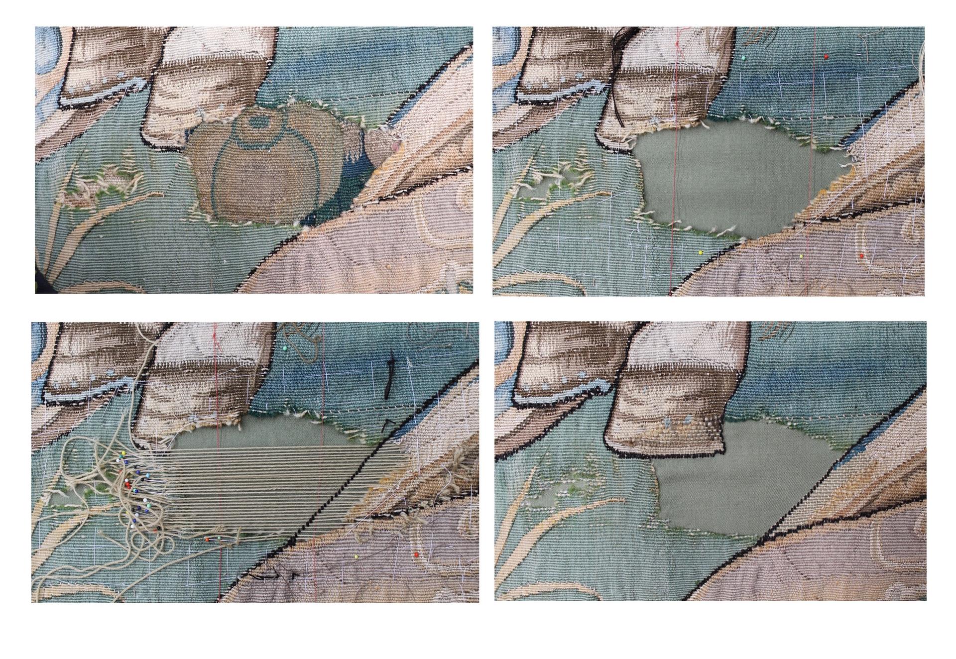 Before and after: a patch made from another tapestry is removed and new stitches fill in a horse's missing hoof © National Trust