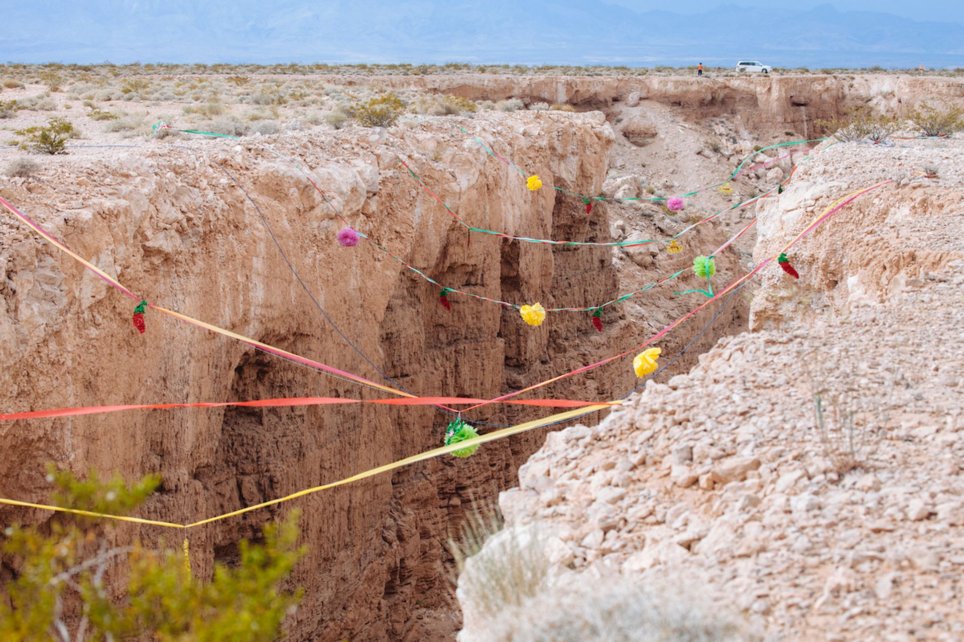 Documentation of Justin Favela's Family Fiesta: Double Negative inside Michael Heizer’s Double Negative (2015) in Land Art: Expanding the Atlas at the Nevada Museum of Art © Justin Favela. Photo: Mikayla Whitmore