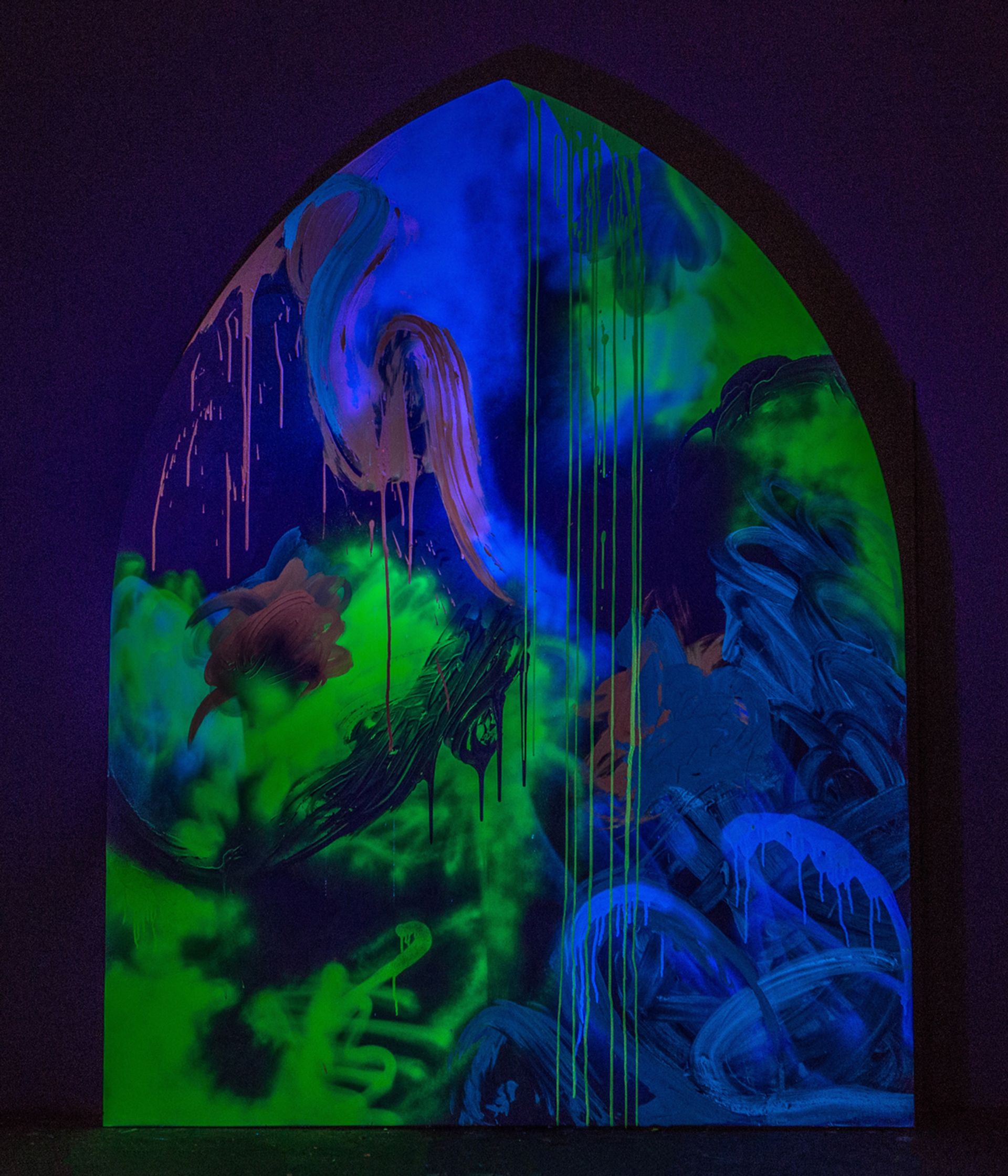 For those who have grown accustomed to the still of lockdown, Kate Dunn’s rave-inspired multi-sensory painting installation may prove an overwhelming experience. A soundtrack of thumping gabber music (a hardcore genre of distorted electronic dance set to a breakneck tempo), accompanies a series of large-scale canvases shaped like Romanesque altarpieces, on to which Dunn has slapped photo-reactive UV paint in unbridled, gestural brushstrokes. Overhead the lights change according to the manic beat, turning the paintings into pulsating bodies of luminescent streaks reminiscent of strobe visuals found in 1990s nightclubs.