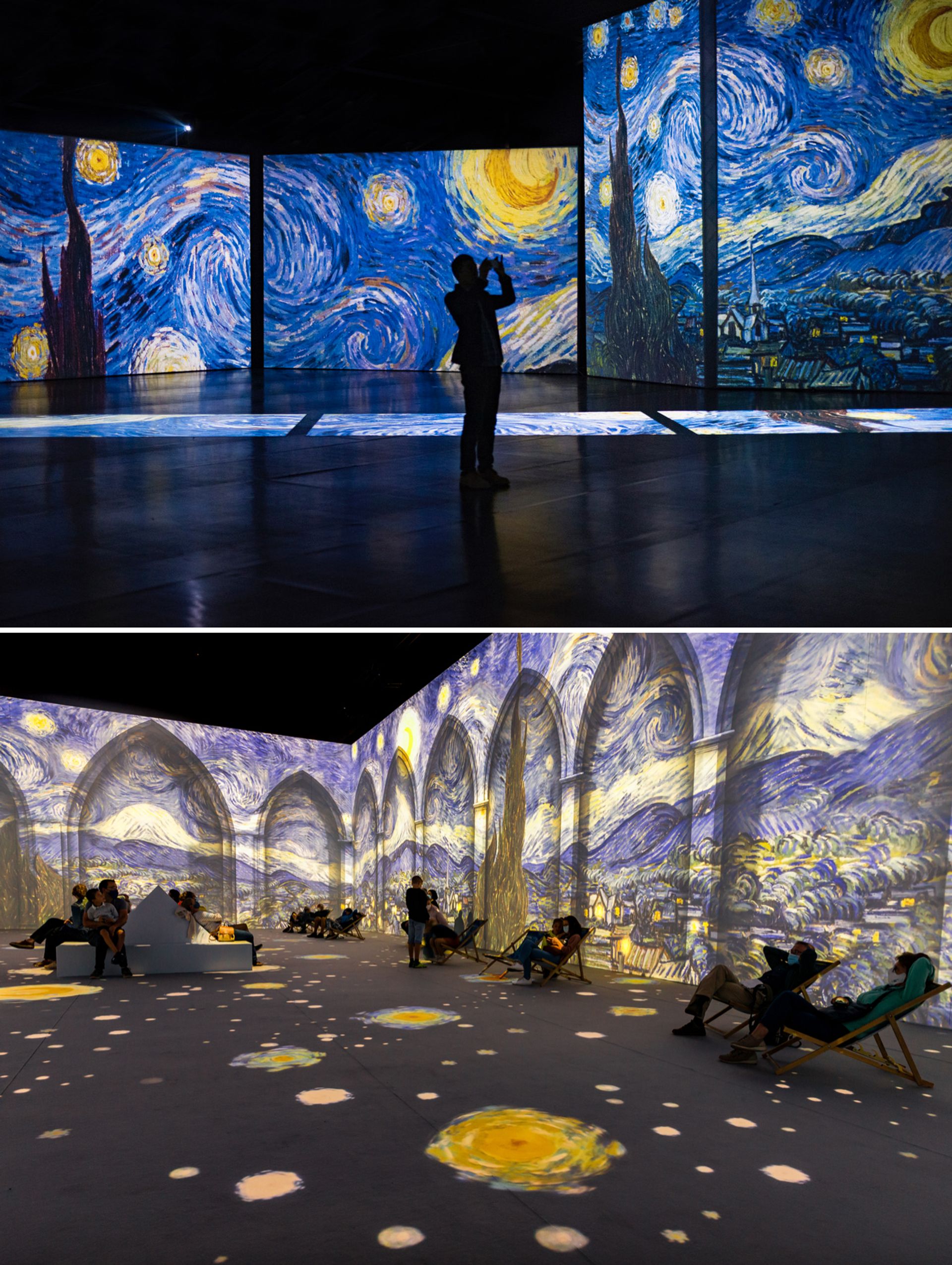 Van Gogh’s Starry Night (June 1889) in two presentations: Van Gogh: the Immersive Experience (above) and Van Gogh Alive: the Experience (below) Courtesy of Van Gogh Alive: the Experience and Van Gogh: the Immersive Experience