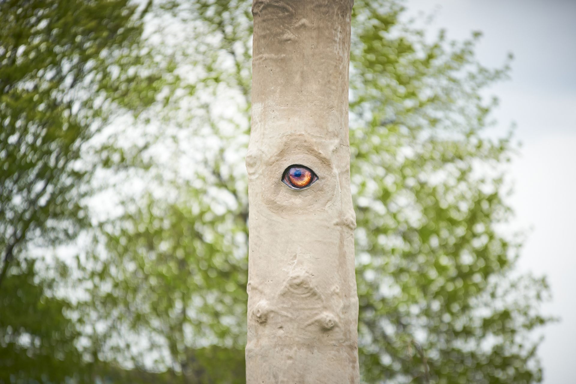 In the centre of Crown Park in Toxteth, a concrete replica of a Pau Rei tree, native to Brazil, has been planted, ringed by a glade of living black beeches. Embedded high on its trunk is a giant golden eye which is copied from that of Bangladeshi pariah dog. When first installed, this uncanny arresting hybrid, commissioned specifically for the biennial, provoked animated debate from local gang members who, once reassured that the eye did not contain a hidden facial recognition camera, have now embraced it as a local artwork. The Spanish-born, Rio-based Steegmann Mangrané also has a film at Bluecoat featuring the stray dogs that live in the Dhaka Art School, further extending his enquiry into the co-existence of nature and culture.