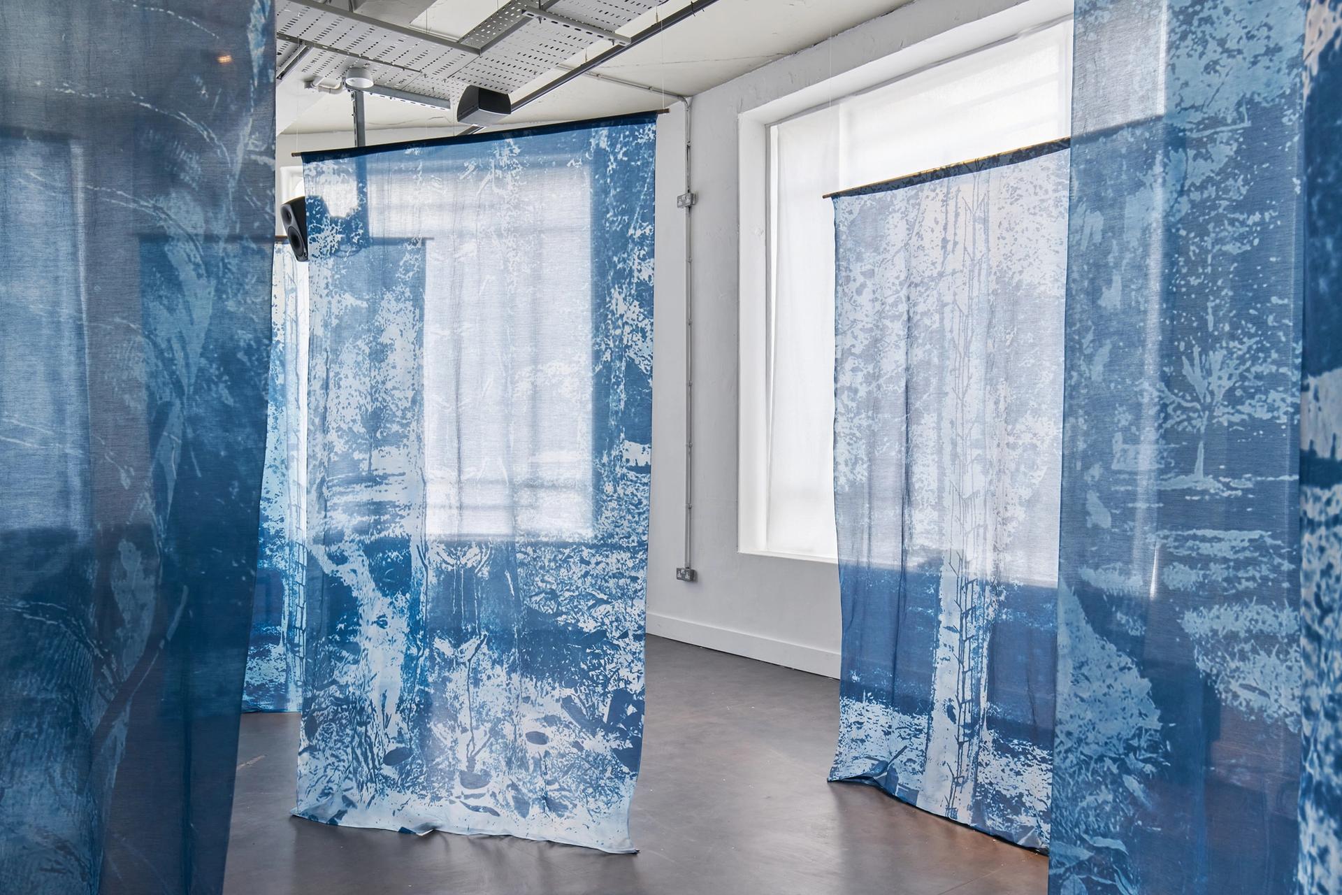 This richly evocative multichannel sound and textile installation follows the laying down of the first underseas telegraphic cable between Britain and India in 19th century, creating a communications infrastructure that consolidated imperial power. The thousands of miles of cable were insulated by the rubbery sap of the gutta percha tree, indigenous to Malaysia but soon planted across the empire. Hameed’s soundscape is accompanied by a maze of cobalt textile banners printed with the scored trunks of these trees. They form both a forest and a watery engulfing environment that highlights the consequences of colonial occupation on both bodies and environments.