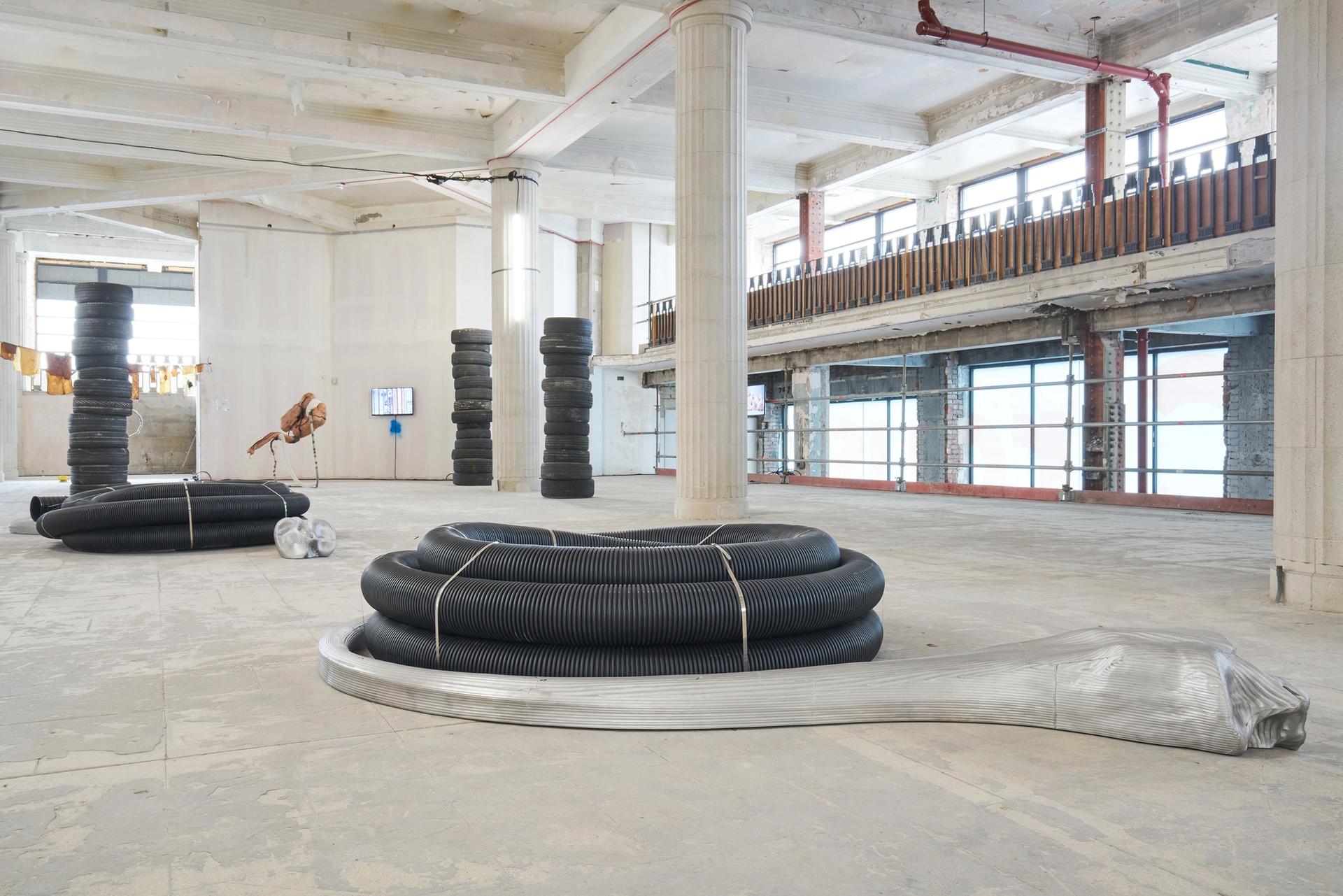 Radically different timeframes and processes, both natural and mechanical, collapse and merge in new sculptures by Alice Channer. Images of geologically folded rock are printed into the surfaces of industrially pleated silk, and infrastructures both organic and manmade are suggested in the coiled forms of heavy duty plastic cable covers. These are in turn echoed in whorls of fossilised ammonites and then combined with giant scaled-up human bones cast in aluminium. An accompanying audio work further excavates these layers of association, combining the sounds of shallow waters, rockpools, motorways and voices both human and non-human.