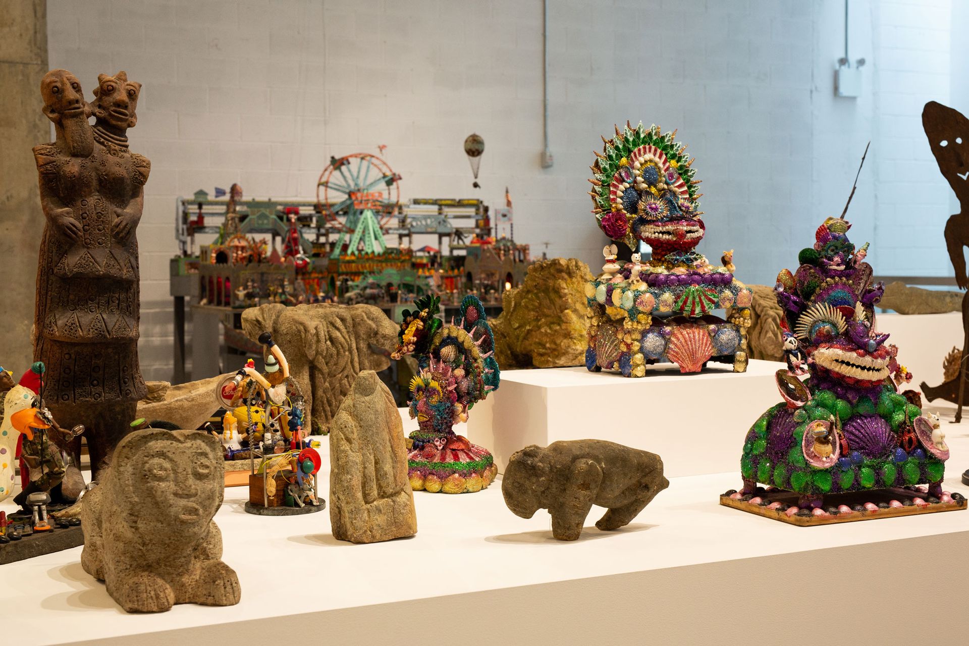 A side project of the Outsider Art Fair, this massive group show—featuring nearly 200 works by around 60 self-taught artists—was co-curated by the mega-artist Takashi Murakami in collaboration with a number of the fair’s dealers and gallerists. Its title, Super-Rough, is of course a nod to the Superflat movement which Murakami started in the early 2000s, and whose aesthetic stands in stark contrast to the rough-hewn works on view in the exhibition. There are pieces included by outsider artists with more prominent followings, such as Judith Scott, Eugene Von Bruenchenhein, William Edmondson, and others, as well as a number of less well-known and anonymous artists. Indeed the show is a riotous medley of textures and materials, and the humming presence of so many handhewn objects, each containing that indelible aura of a totem so beloved by its maker, come together in thrilling harmony.