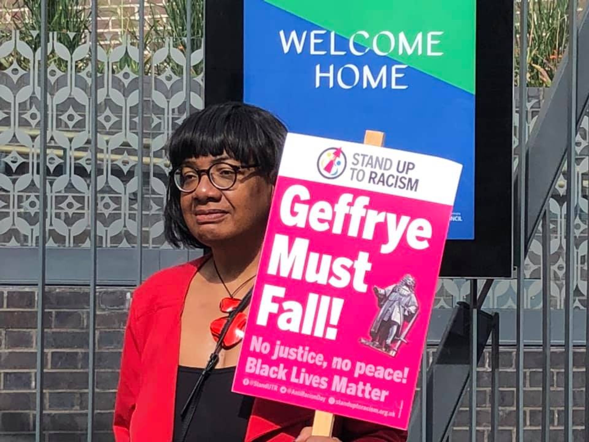 In a video streamed on social media, Labour MP Diane Abbott calls on “the leadership of the museum to take down the statue and listen to the community… Geffrye must fall.” Photo: Stand Up to Racism / Facebook