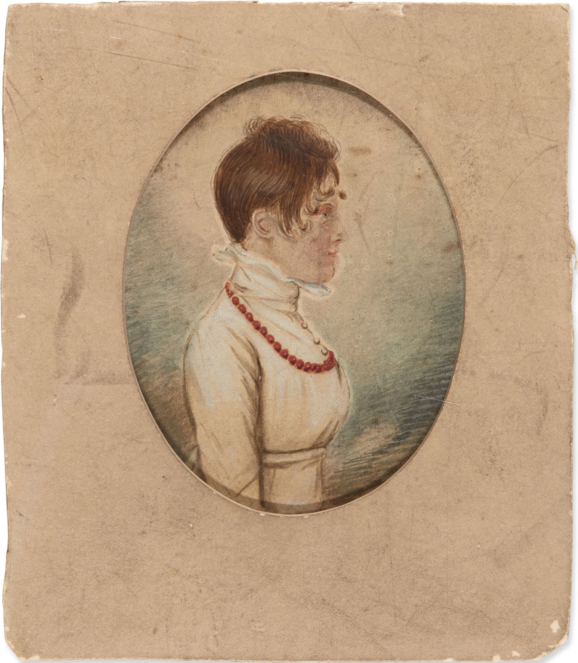 Charlotte Brontë Profile portrait of a woman, possibly Elizabeth Branwell, quarter length, in a white dress with a red beaded necklace ( around 1833-34) Image: courtesy of Sotheby's