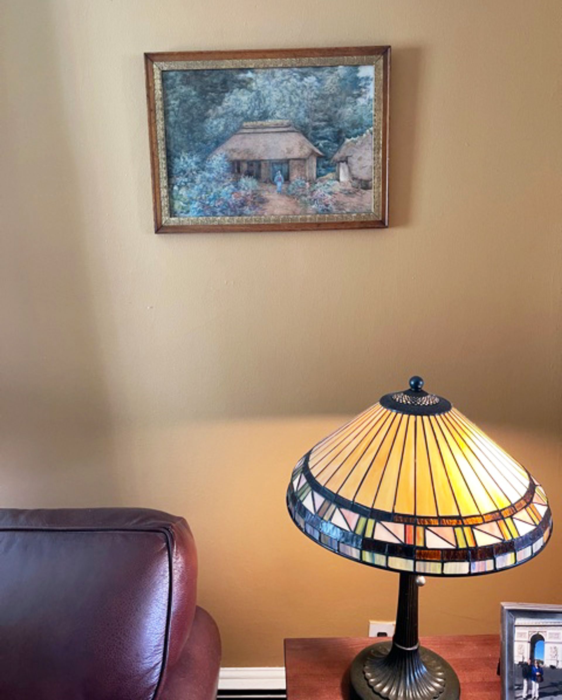 Edmund Brooke’s Japanese landscape with a mother and child hanging in the dining room of Katherine and John Mathews's home, May 2021 Courtesy of John Mathews, Scarborough, Maine