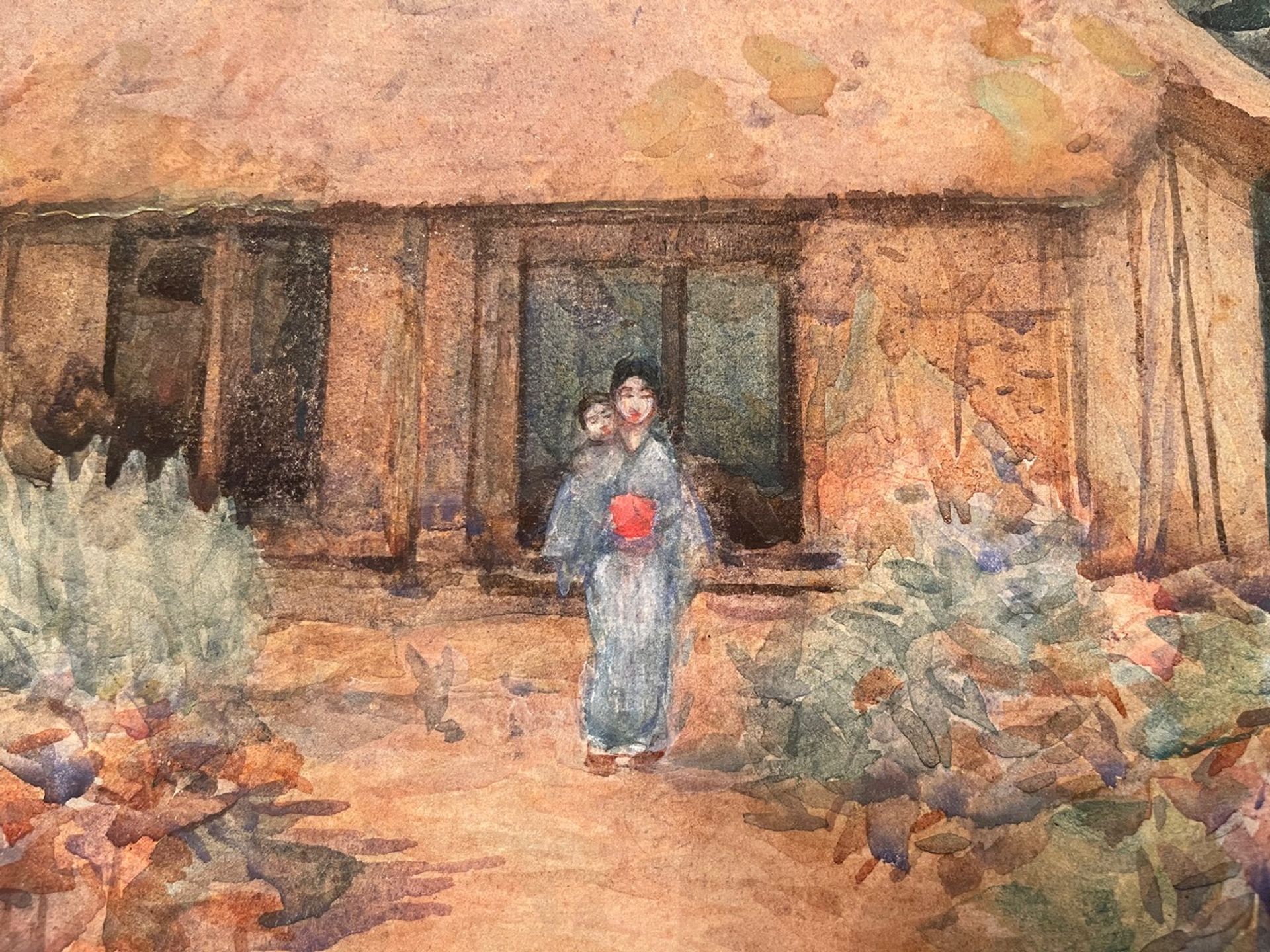 The watercolour’s lush landscape includes a woman in a kimono carrying a baby on her back as she leaves a traditional Japanese house. As reported in the New York Times, it was purchased by Katherine and John Mathews of Scarborough, Maine. They bought it at Warehouse 839, a shop run by Kevin Keraghan in nearby Saco that sells second-hand furniture and collectables.