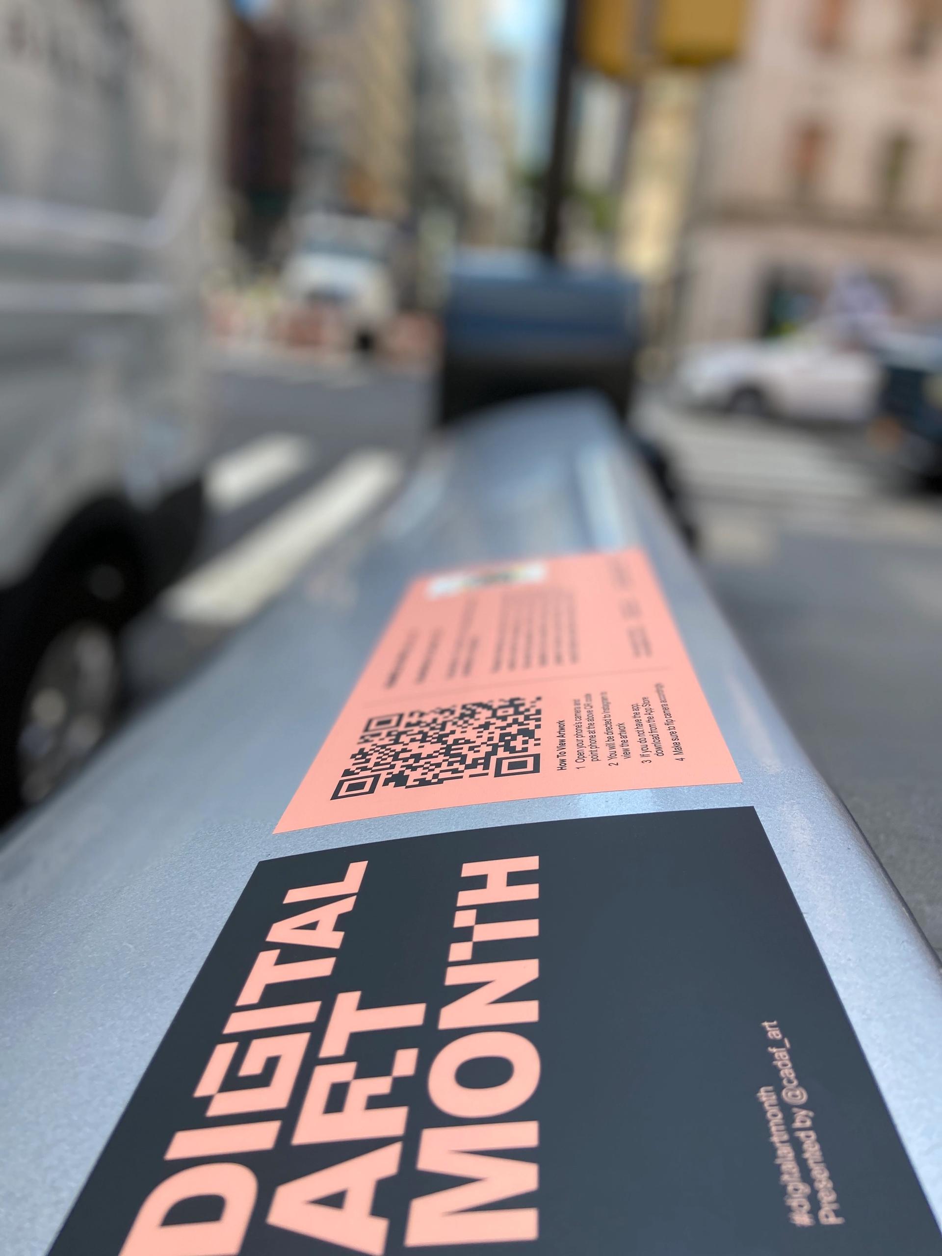 The Digital Art Month stickers throughout Paris include a QR code, Instagram handles for participants, information about the work and a link to the fair's website where you can buy digital works Courtesy of CADAF