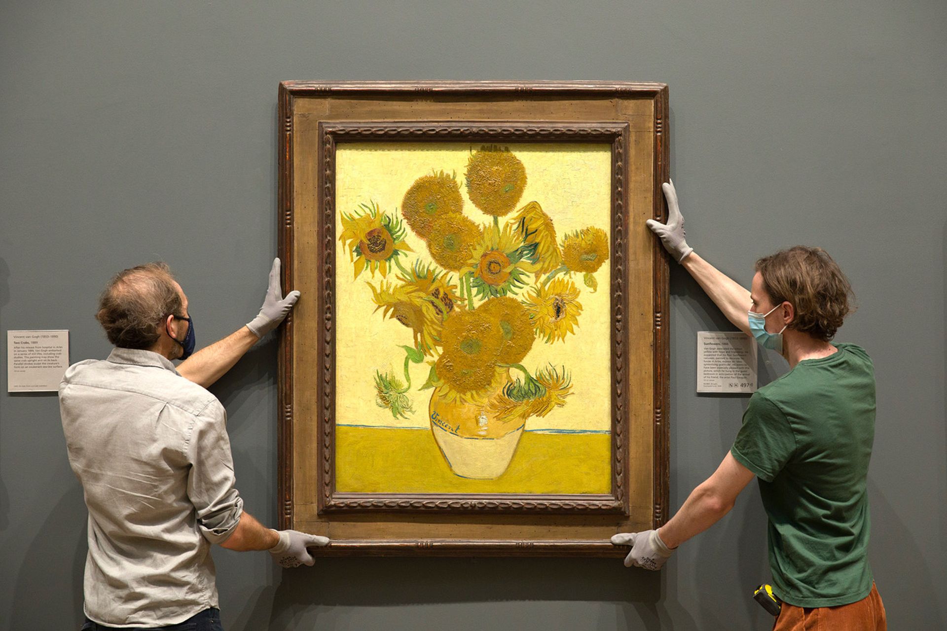 Van Gogh’s Sunflowers being rehung at London’s National Gallery this week, after its return from a tour to Japan and Australia © National Gallery, London