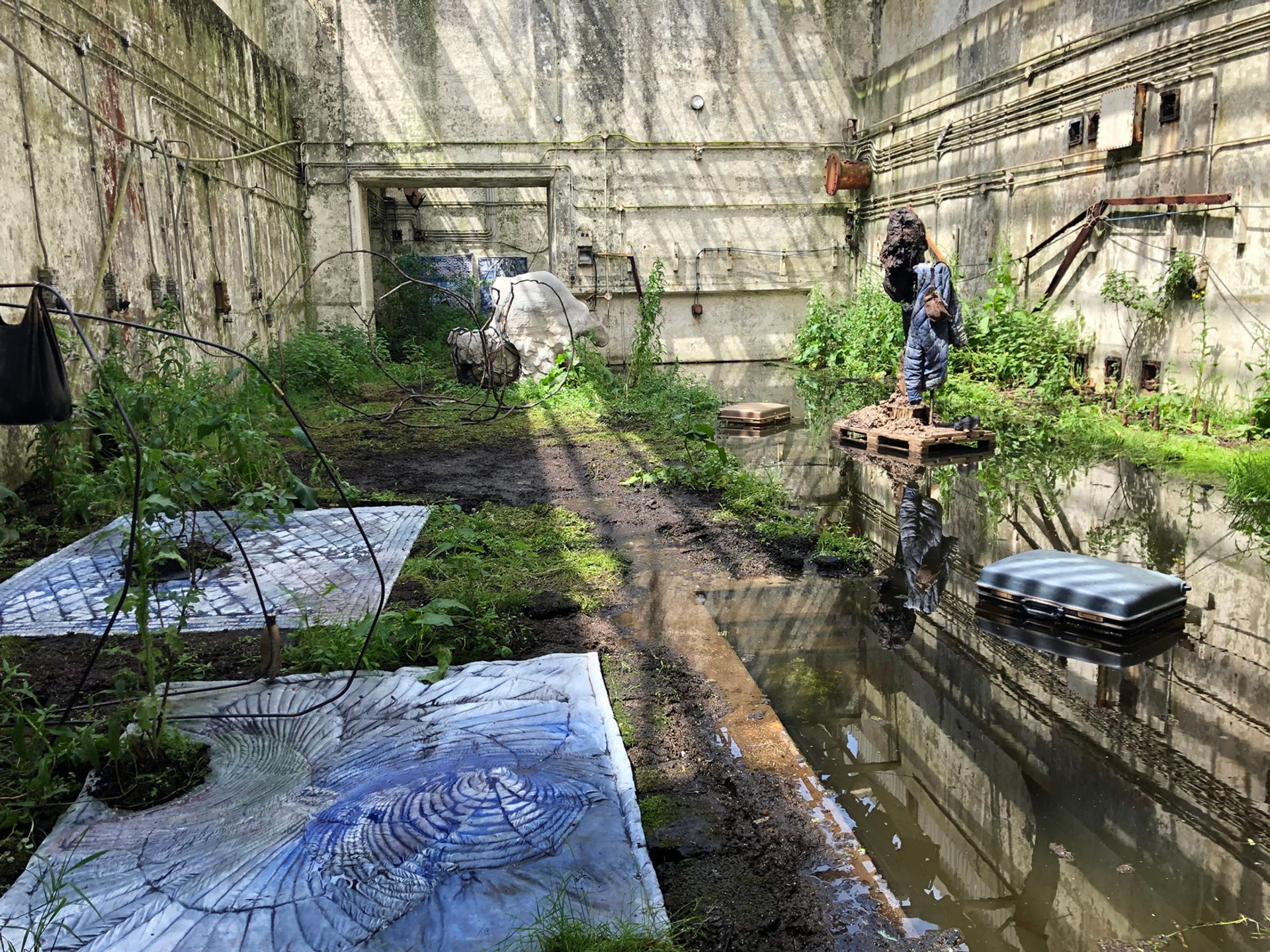 This summer however, Orford Ness is playing host to the work of five artists, commissioned by Artangel, an organisation that presents art in unexpected places. (There is also a series of specially made online works, with all works under the umbrella title of Afterness.) When I visited it was wet and windy, perfect conditions for a place that is a dead ringer for the damp dystopian Zone, an extraterrestrial site in Tarkovsky’s 1979 film Stalker. Nowhere is this more the case than in the vast roofless shell of Lab 1, built in the ‘60s for testing atomic weapons, where Tatiana Trouvé has scattered what appear to be the possessions of former occupants fleeing some kind of disaster. But these strewn quilts, overspilling bags and discarded books are all in fact trompe l’oeil sculptures, cast in bronze and aluminium or carved in marble. Dotted throughout this decaying, waterlogged interior, Trouvé’s The Residents stands as a desperately sad reminder of the human havoc caused by the weapons so assiduously developed here over the years.