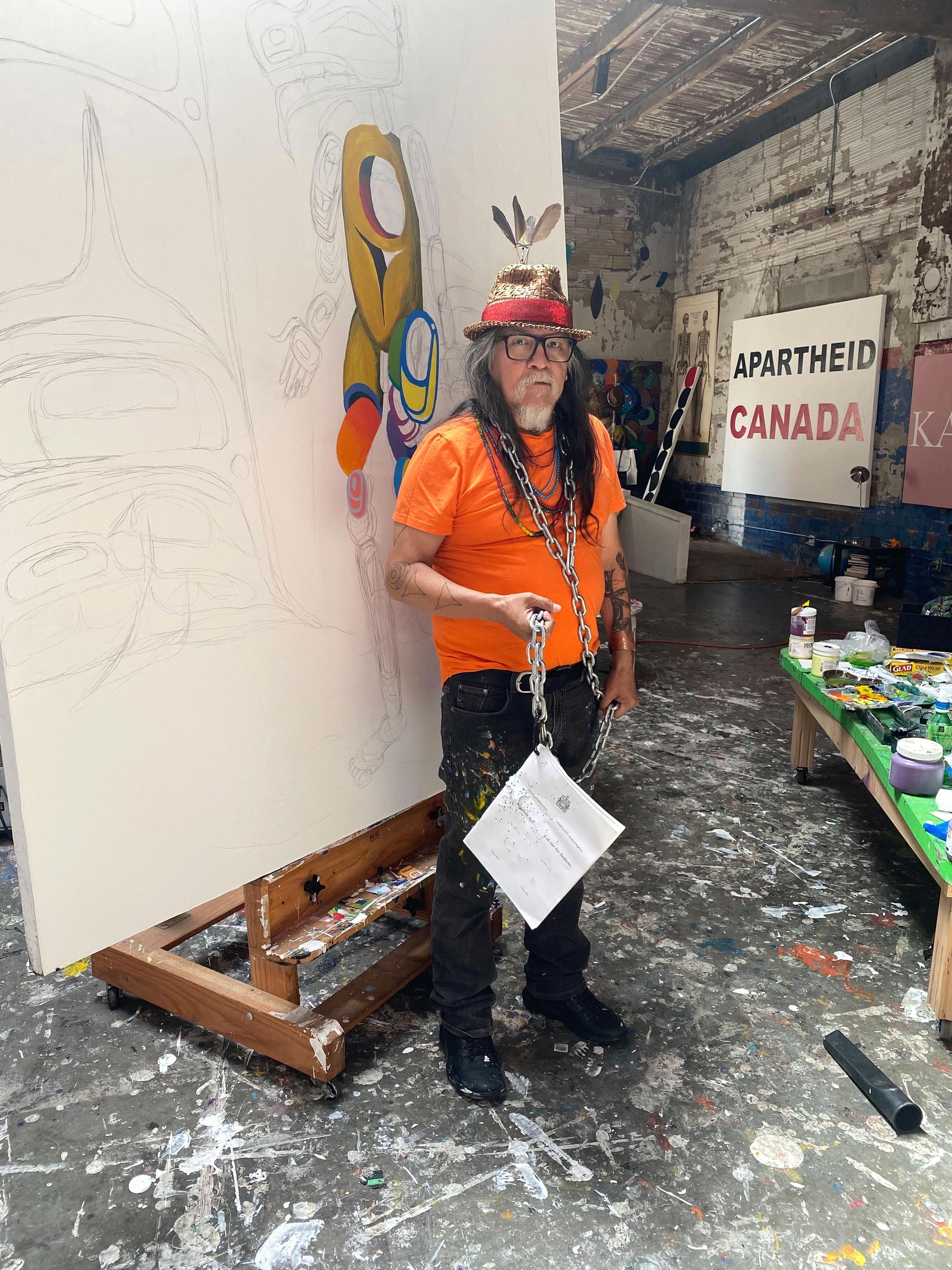 The chain will eventually be at the centre of a forthcoming performance piece, Yuxweluptan says, to raise some important questions: “When will we emancipate the Indian? How do I become free? Can you be a free person in an apartheid state?”