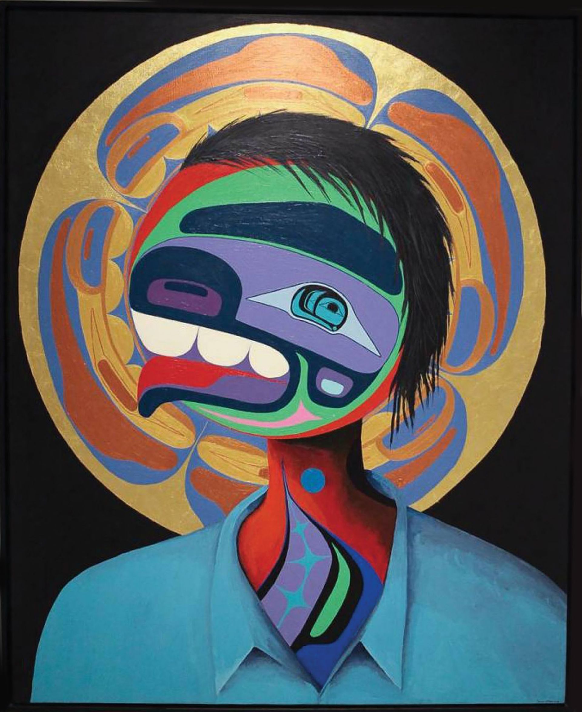 In his portrait, Yuxweluptun simultaneously subverts and incorporates the Christian halo by fusing gold leaf with traditional images of human guardian spirits and the four directions. The painting is a response to the church’s dehumanisation of Indigenous peoples, the artist says, and his intent was to show that “the child—given a traditional salmon/trouthead eye—is sacred and that they killed his body but not his spirit”.