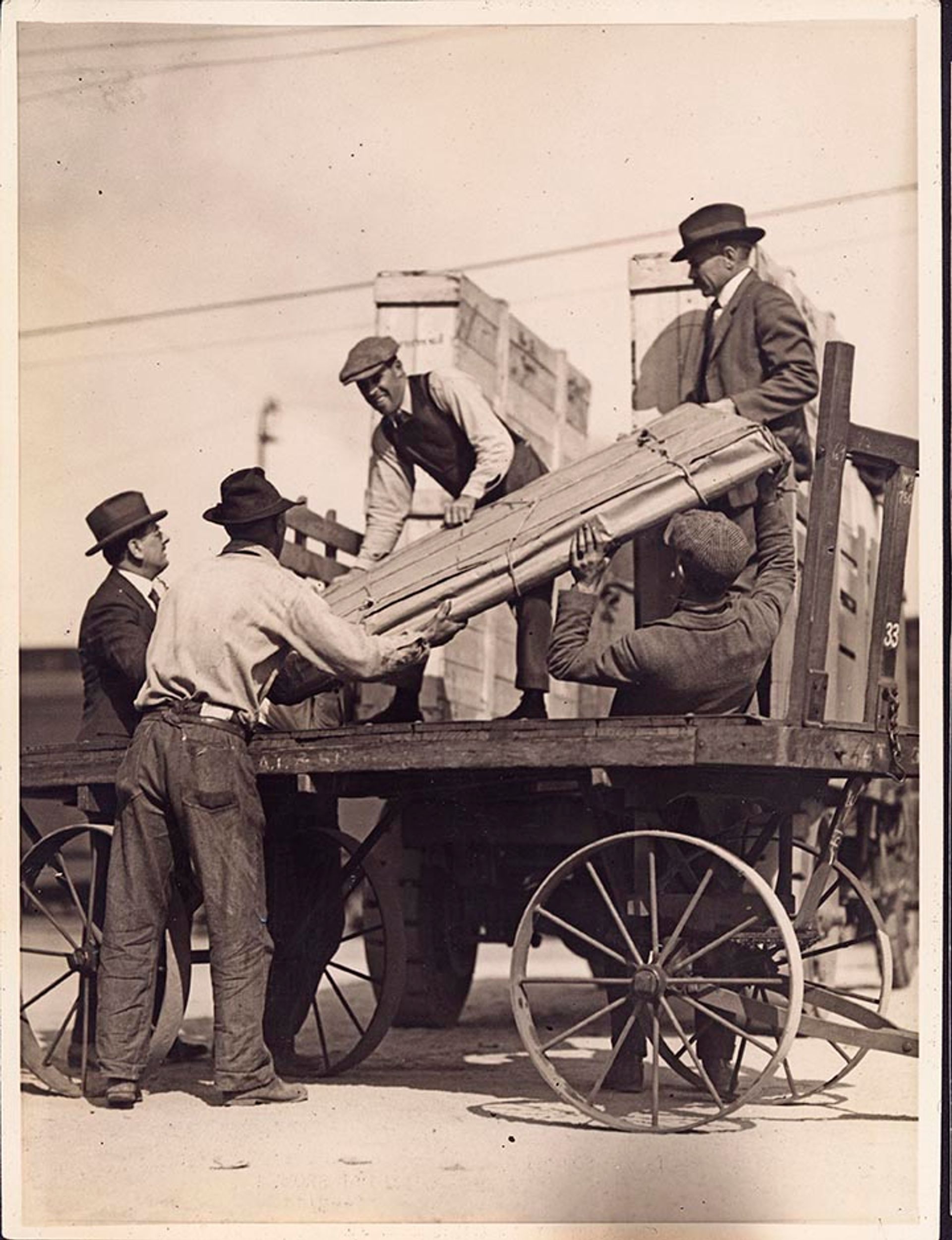 The Blue Boy being unloaded from a train in 1922 © Photo by “International,” Los Angeles Bureau. “Famous Painting Arrives.”