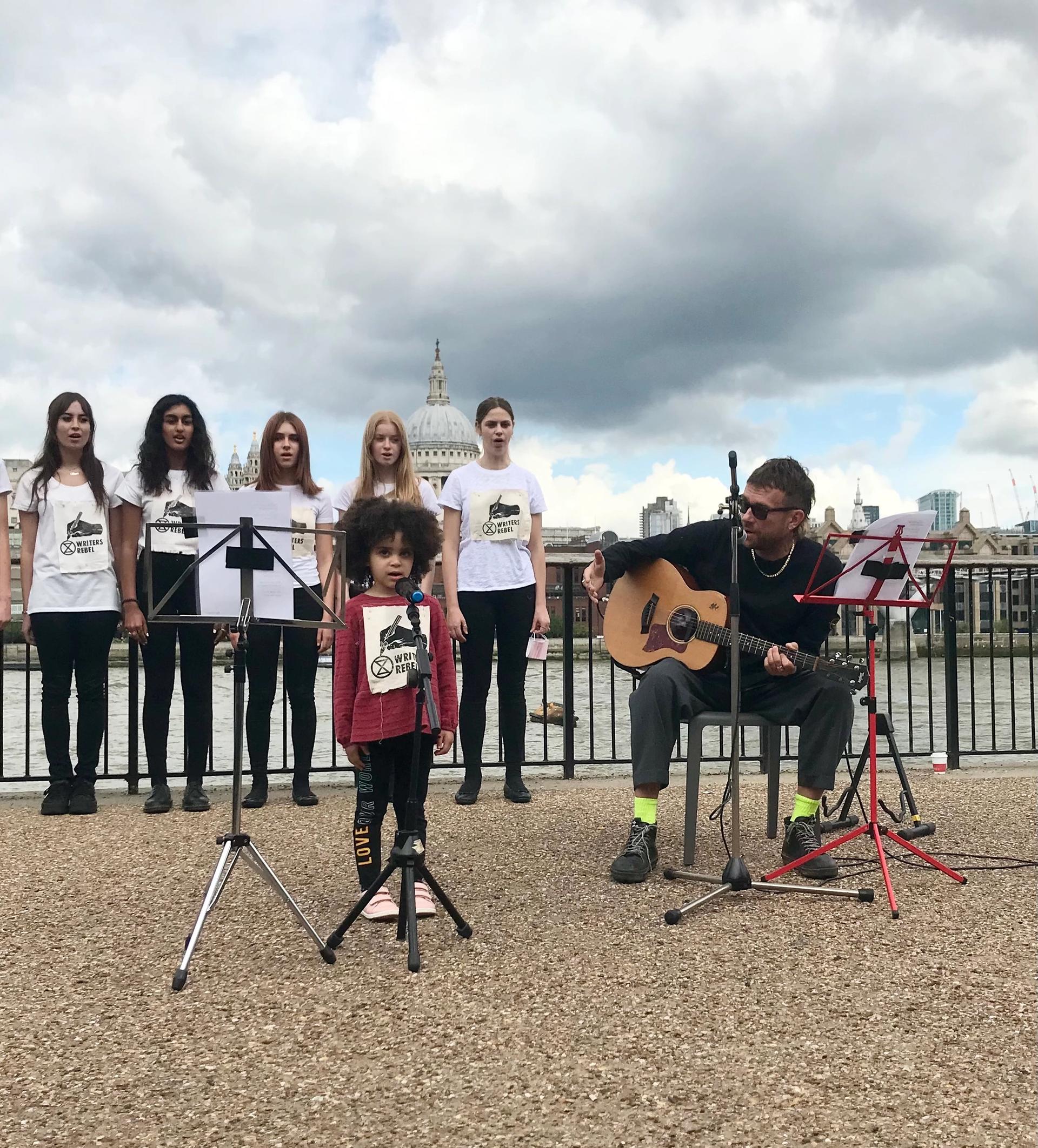 Back up on the walkway the rapidly rising river and St Paul’s cathedral acted as a backdrop for a series of passionate pleas from XR Writers Rebel to save our beleaguered planet. “This earth that we love is in great danger because of us: we have raped her, exploited her, abused her destroyed her, wrecked her, disembowelled her,” declared Ben Okri, who, after listing some more of humankind’s abuses, elaborated on his text written into Ackroyd & Harvey’s grass by offering a paean to the power of love as “the highest economy of life, the most efficient force of civilisation”. The speech ended with his stirring statement written into Ackroyd & Harvey’s grass that “only love will save the world”.