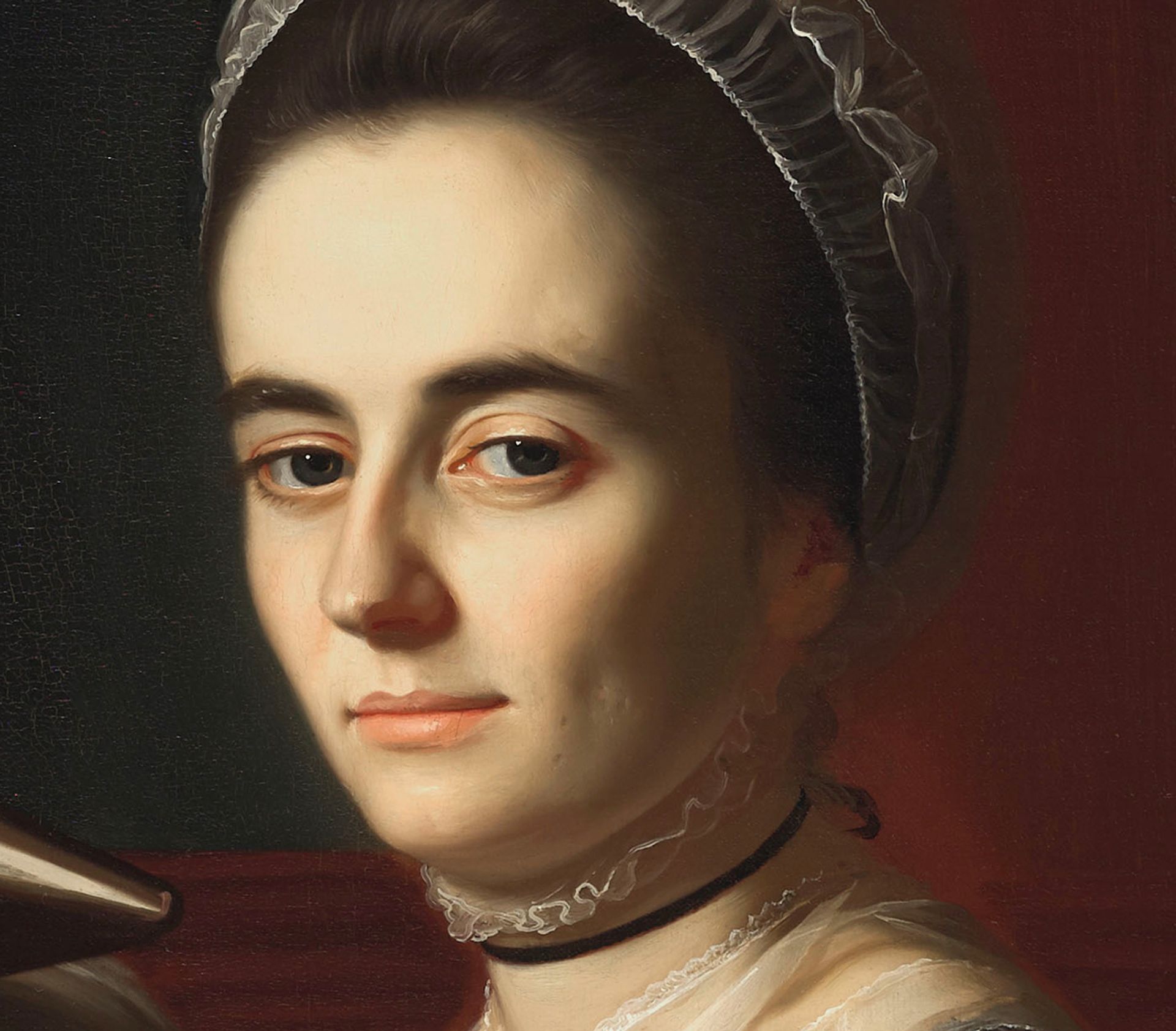 The cleaning brought out finely painted details such as grey strands of hair and pock marks on Mrs Mifflin's forehead and cheek Image courtesy of the Philadelphia Museum of Art