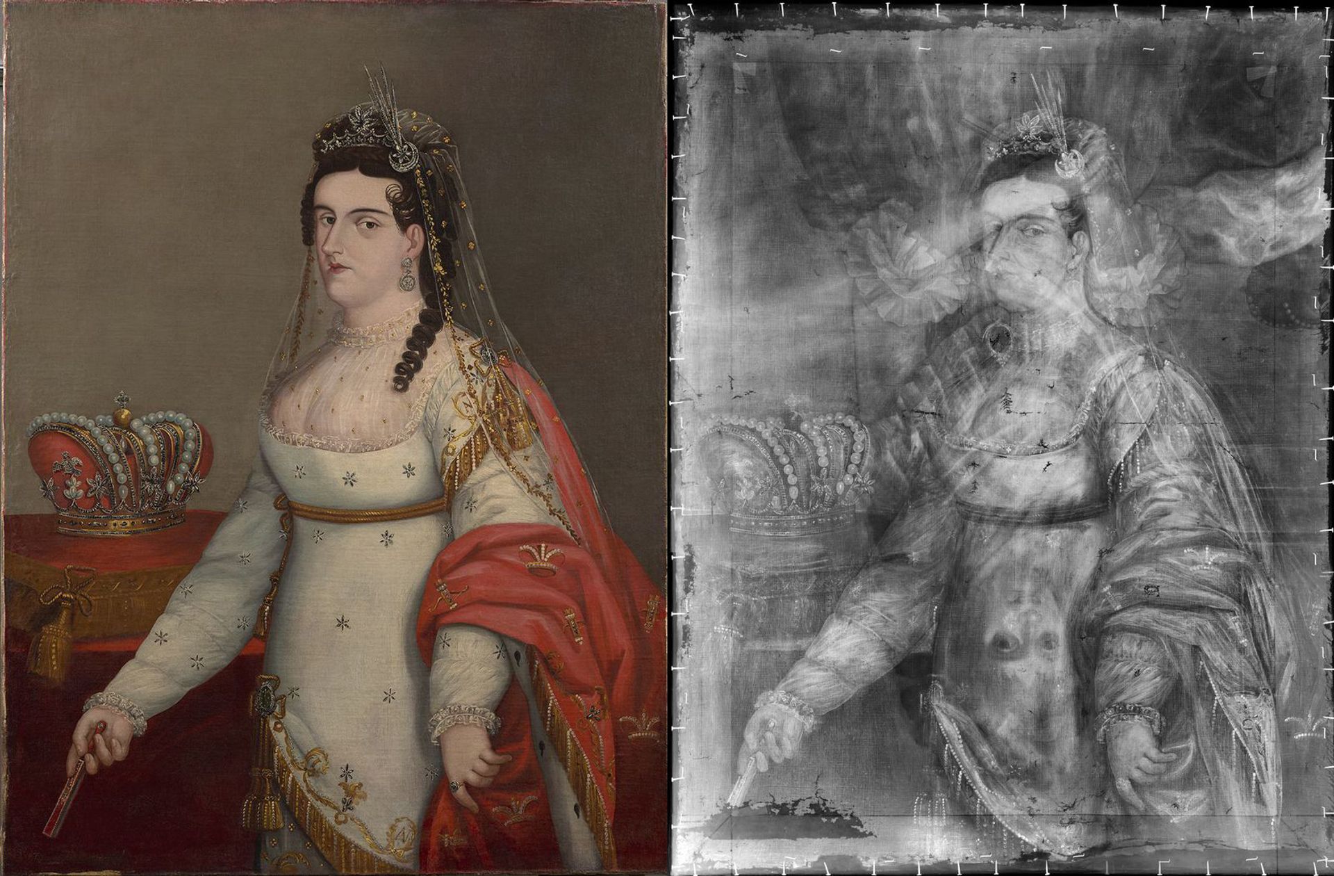 An X-ray of this portrait of Ana María Iturbide, Empress of Mexico (1822) revealed an upside-down face lurking in her belly. An artist had painted over an earlier painting of Maria Luisa of Parma, the Queen consort of Charles IV of Spain Images courtesy of the Philadelphia Museum of Art