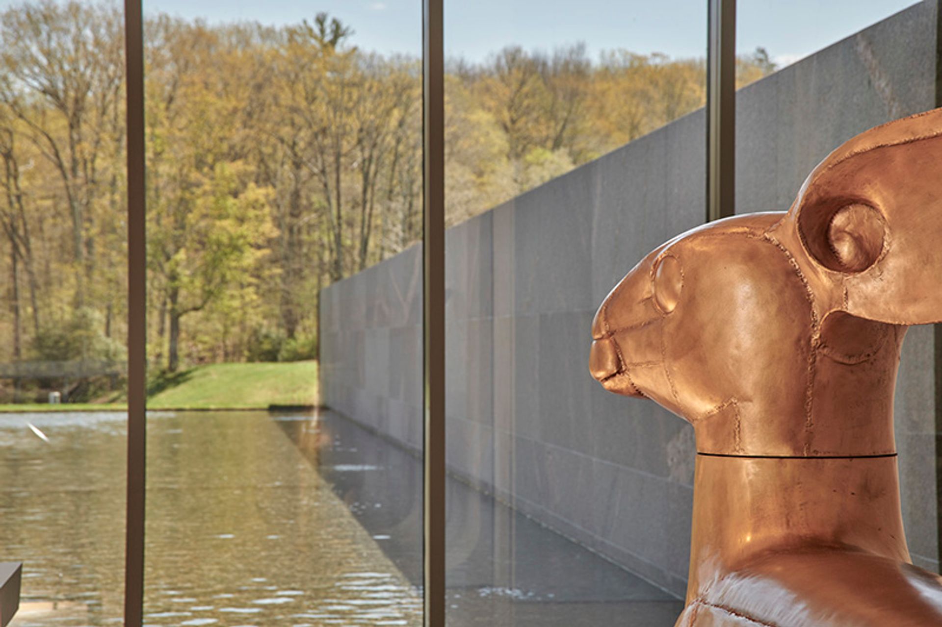 An indoor and outdoor exhibition devoted to the late French artists Claude and François-Xavier Lalanne, known collectively “Les Lalannes”, celebrates their dreamlike, nature-infused designs and sculptures, from their cutesy sheep ottomans to a bronze severed head encased in foliage. It marks the first US show dedicated to the artists in more than four decades, and their first institutional exhibition since the death of Claude Lalanne in 2019. On a hillside adjacent to the museum, visitors can see some grazing cows and the outdoor exhibition Ground/Work. The plein air show was unveiled last year amid the pandemic and features several enigmatic sculptures by artists like Eva Lewitt, Kelly Akashi and Nairy Baghramian.