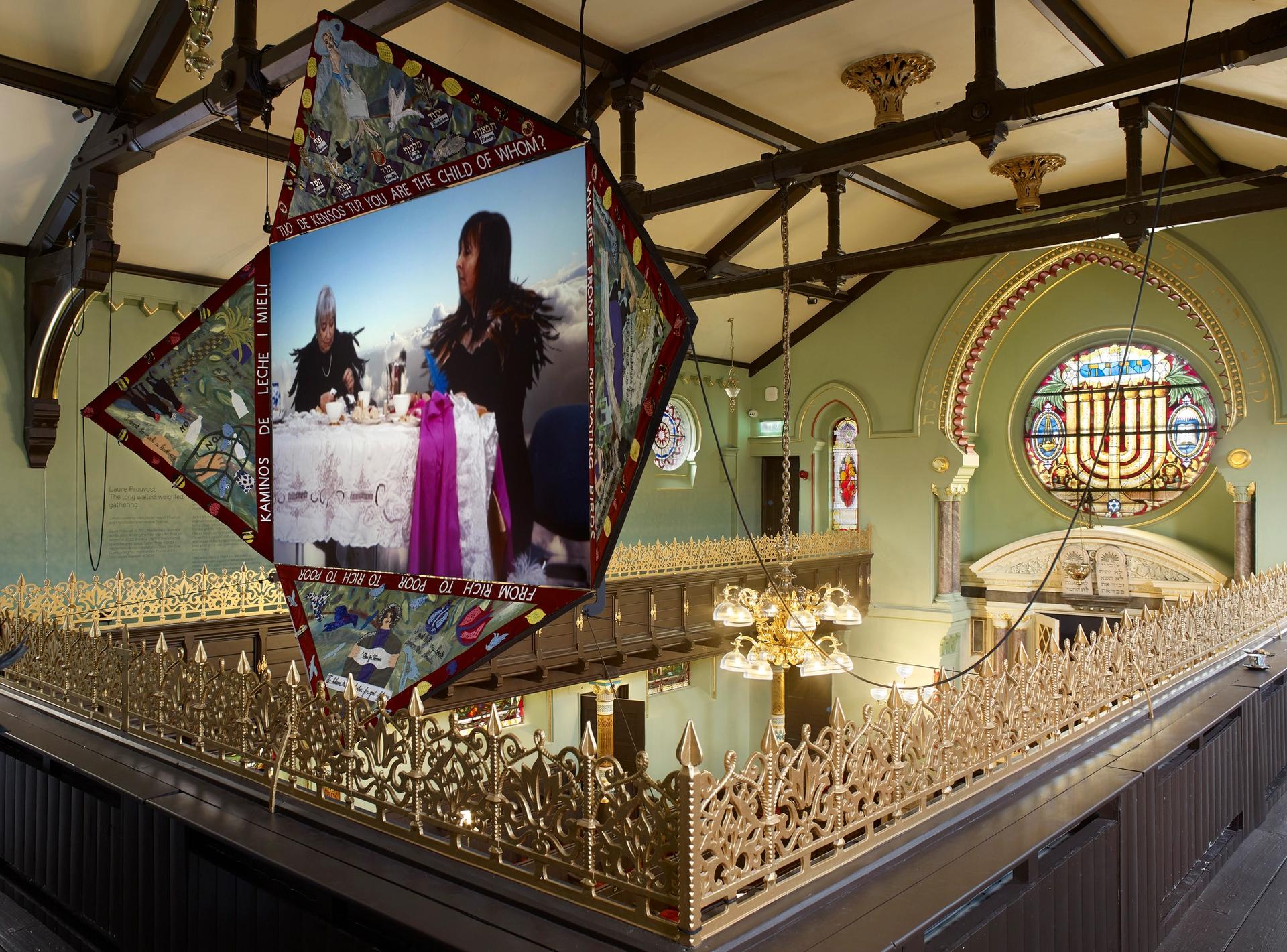 There is a big build up to Turner prize-winner Laure Prouvost’s new installation at the relaunched Manchester Jewish Museum. Visitors are encouraged to first digest the history of Jewish settlement in Manchester in the new permanent gallery, part of a two-year refurbishment costing £6m. Among the 30,000 items housed at the new institution is a letter from Helen Taichner whose family were murdered in the Holocaust. After she got a permit to travel from Katowice in southern Poland to Manchester, she wrote to a relative in 1946: “My happiness is boundless.” The permanent collection puts Prouvost’s piece in context, providing a backdrop to the artist’s composition. Visitors are ushered into the upper Ladies Gallery, where women gathered to watch the men worshipping below in the Spanish and Portuguese Synagogue built by Sephardic Jews in 1894.