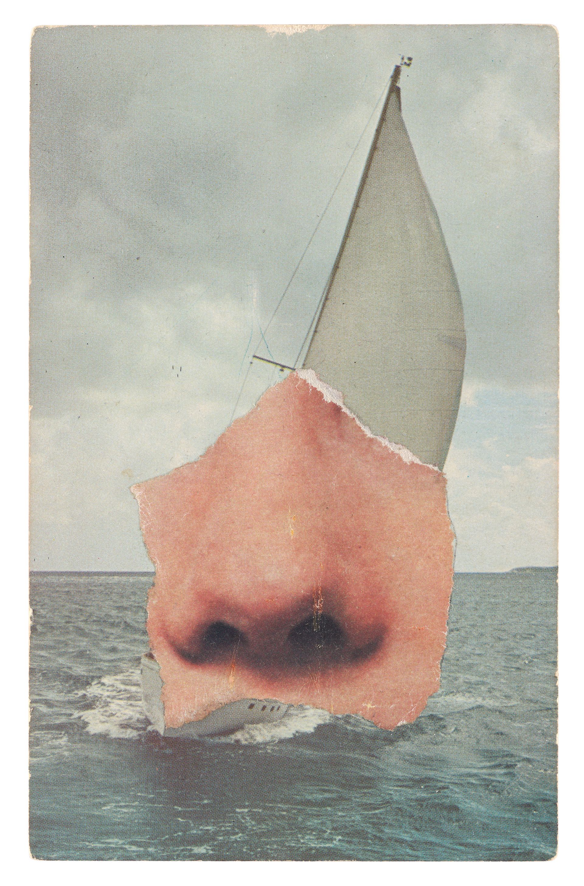 Kelly’s visual puns are also evident in the postcard collages. “The playful part comes in responding to the postcard—putting a colossal nose on a beach scene,” Berry says, adding that “there’s a more serious, experimental side going on when he is, in a sense, using postcards as an extension of his sketchbook.”
