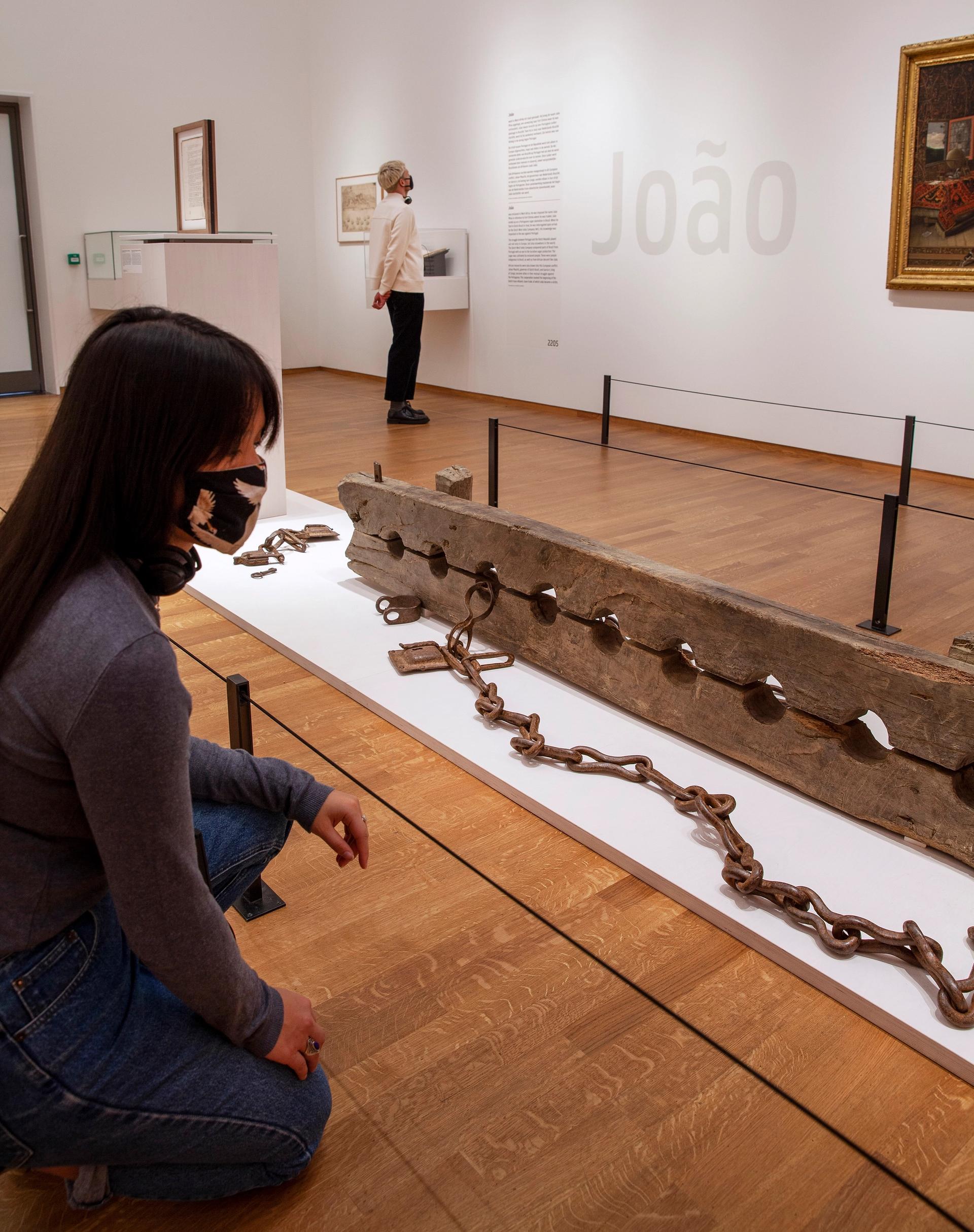 Slavery begins with some historical contextualisation mediated through La Bouche du Roi (1997-2005), an installation by Romuald Hazoumè that evokes a slaving vessel, before narrowing its focus to the ten stories. The first of these is of João, abducted in Africa and conveyed to Brazil. In the centre of the room dedicated to João lie foot stocks designed to constrain enslaved people. The next story is of Wally, who laboured on a sugar plantation in Suriname. With his story, the exhibition illuminates the excruciating work entailed in the production of sugar, as well as drawing attention to the technologies of control exerted remotely from the Netherlands by an absent plantation owner.