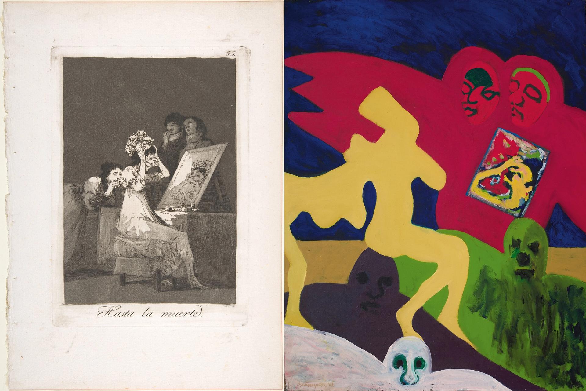 From left, Francisco Goya, Hasta la muerte, from Los Caprichos (1799); Bob Thompson, untitled (1962) (for Thompson work) © Michael Rosenfeld Gallery LLC, New York; photo: Peter Siegel, Pillar Digital Imaging LLC