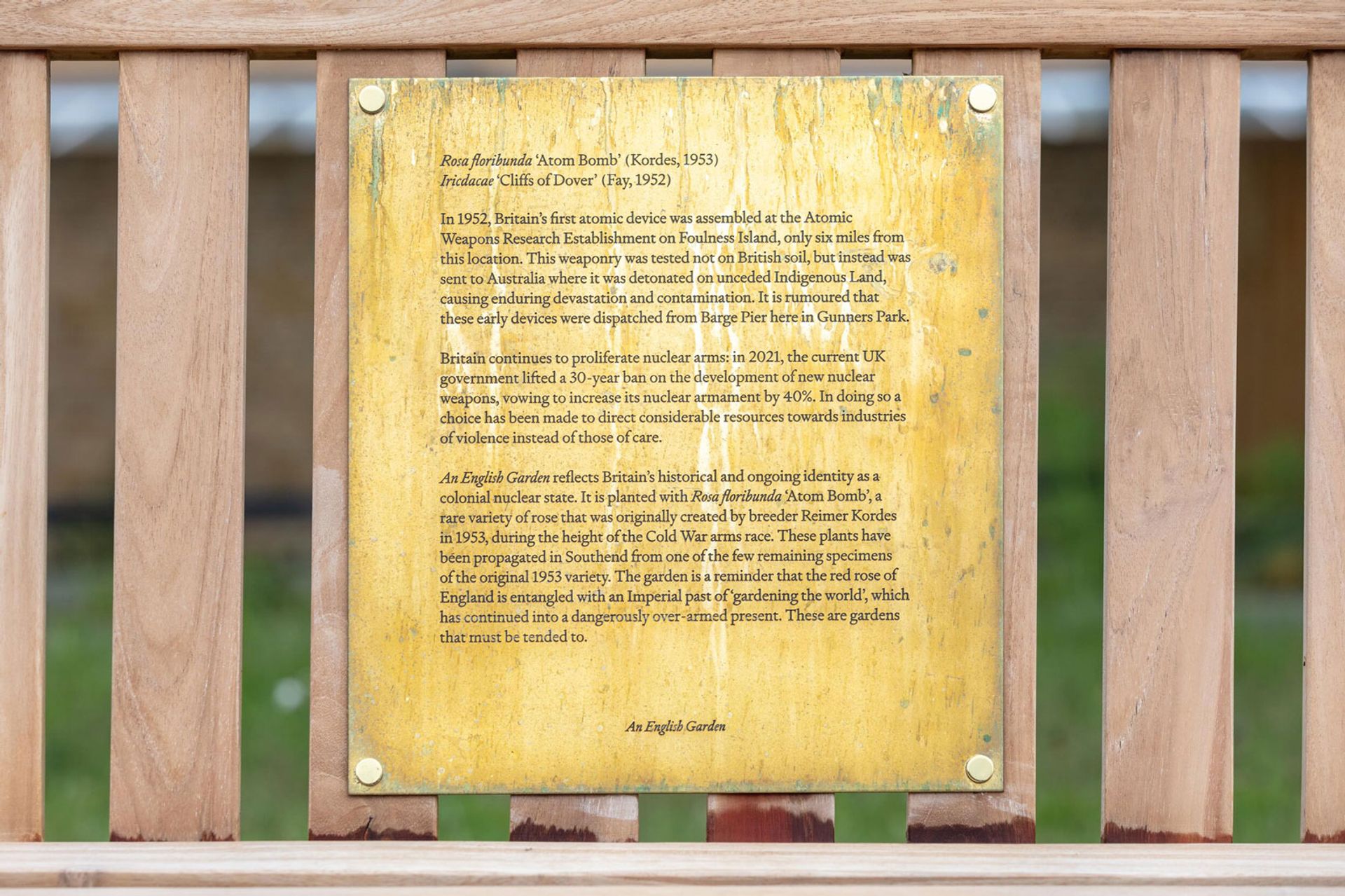 The work by Gabriella Hirst, titled An English Garden, was on show in Gunners Park in Shoeburyness and consisted of flowerbeds planted with the Atom Bomb rose variety and Cliffs of Dover irises, surrounded by three park benches. The objection appears to be focused on the inscriptions on the plaques attached to the benches. One of the texts details the development of the UK’s first atomic bomb at a research facility on nearby Foulness Island in the early 1950s, which was subsequently tested off the northwest coast of Australia, and the recent UK government announcement of a 40% increase in operational nuclear missiles.