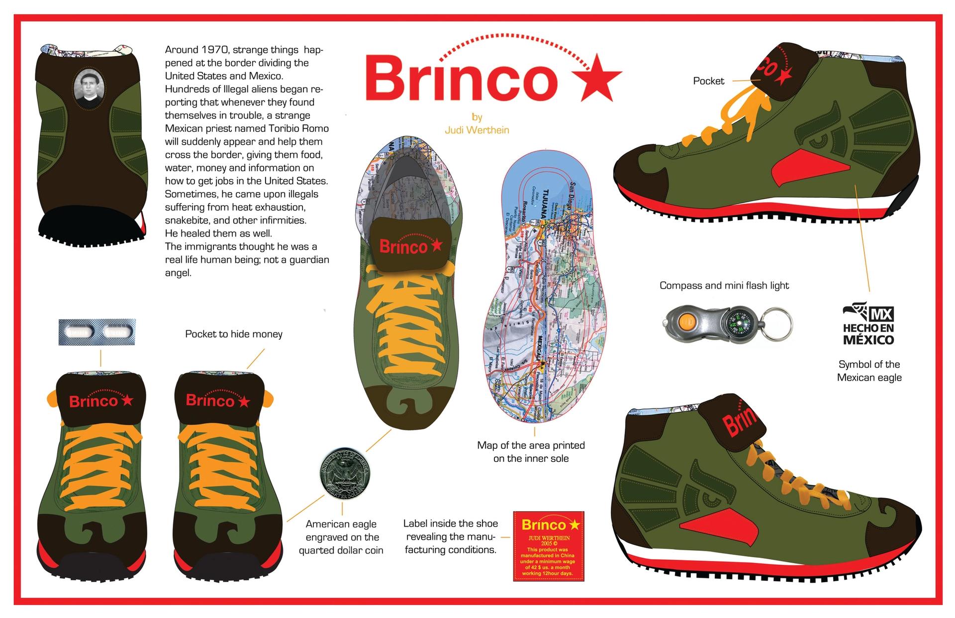 Taking the shape of a custom-made designer sneaker, Judi Werthein's Brinco (Jump) (2005) is is meant to aide those seeking to cross the border between Mexico and the US, with hidden pockets for money and medicine, a miniature compass and flashlight, and a map printed on the insole Courtesy of the artist and Insite_05, San Diego, California
