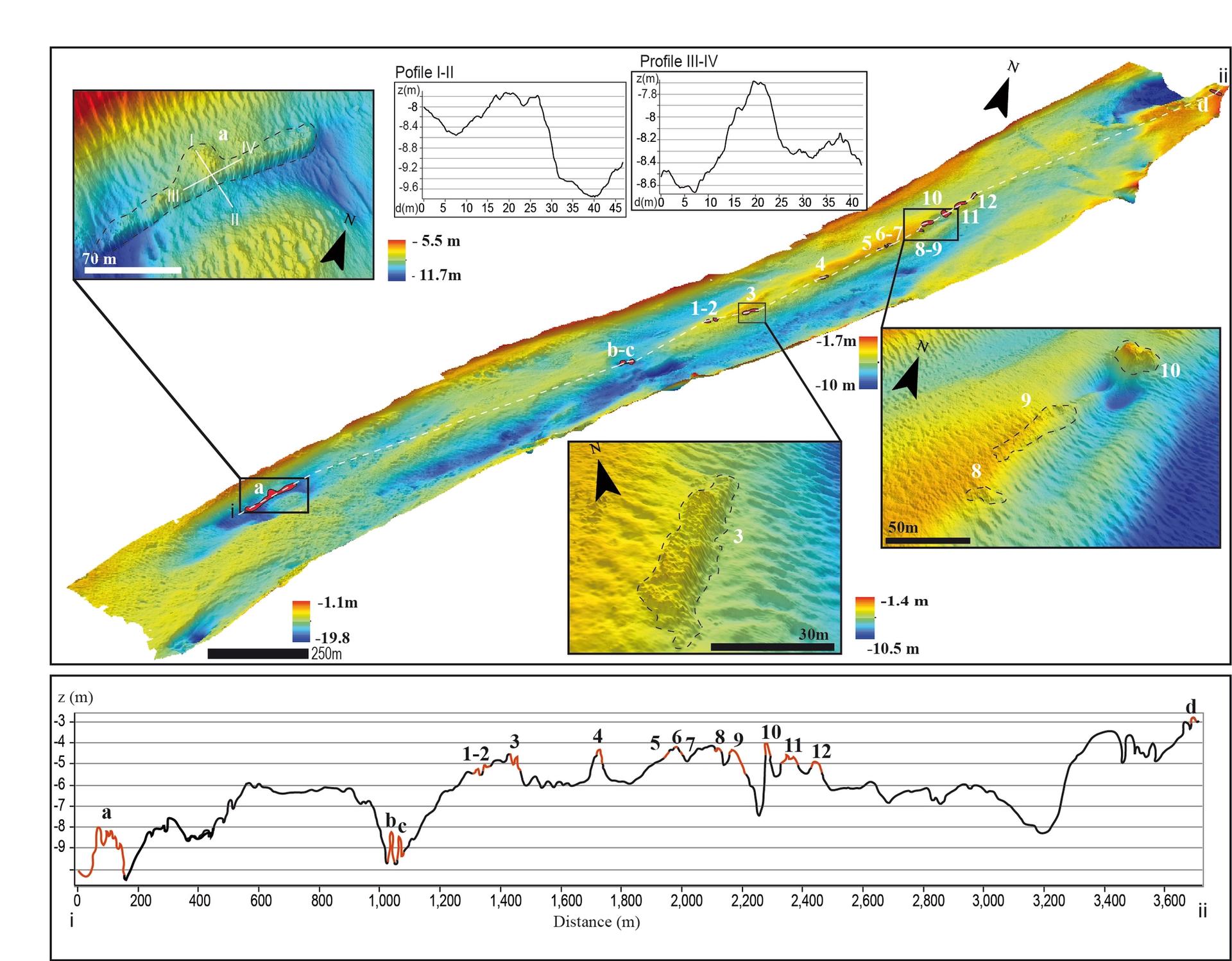 High resolution bathymetry of the Treporti Channel. The zoomed-in images show the details of some of the archaeological structures, one of which could possibly be part of a harbour (top left) Photo: Federica Foglini