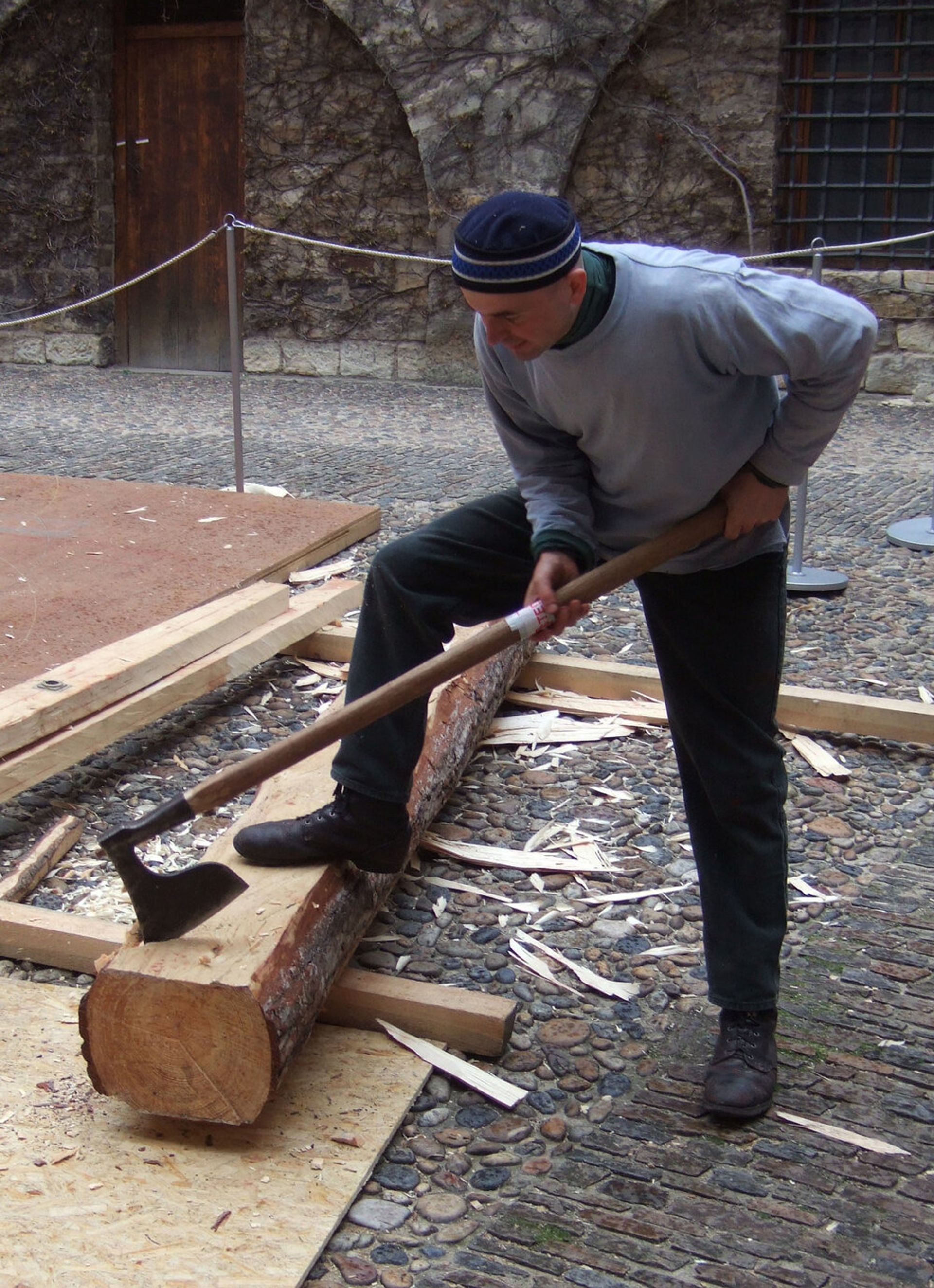 A timber framer squares a log for Handshouse's Tocnik Crane project in Czech Republic Photo: Handshouse Studio